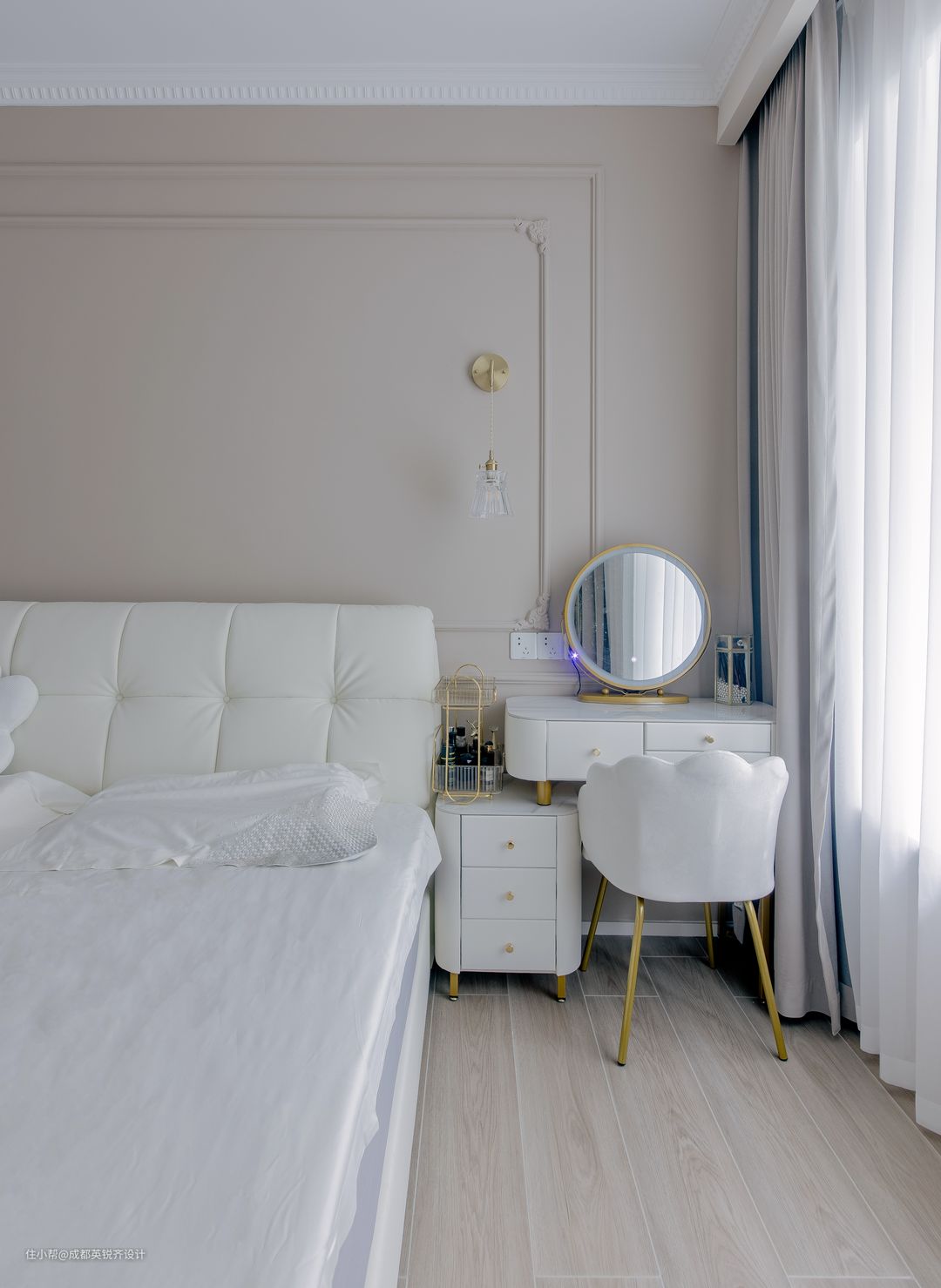 卧室采用木纹砖进行铺贴 集于衣帽间,梳妆台,睡眠区为一体的套房
