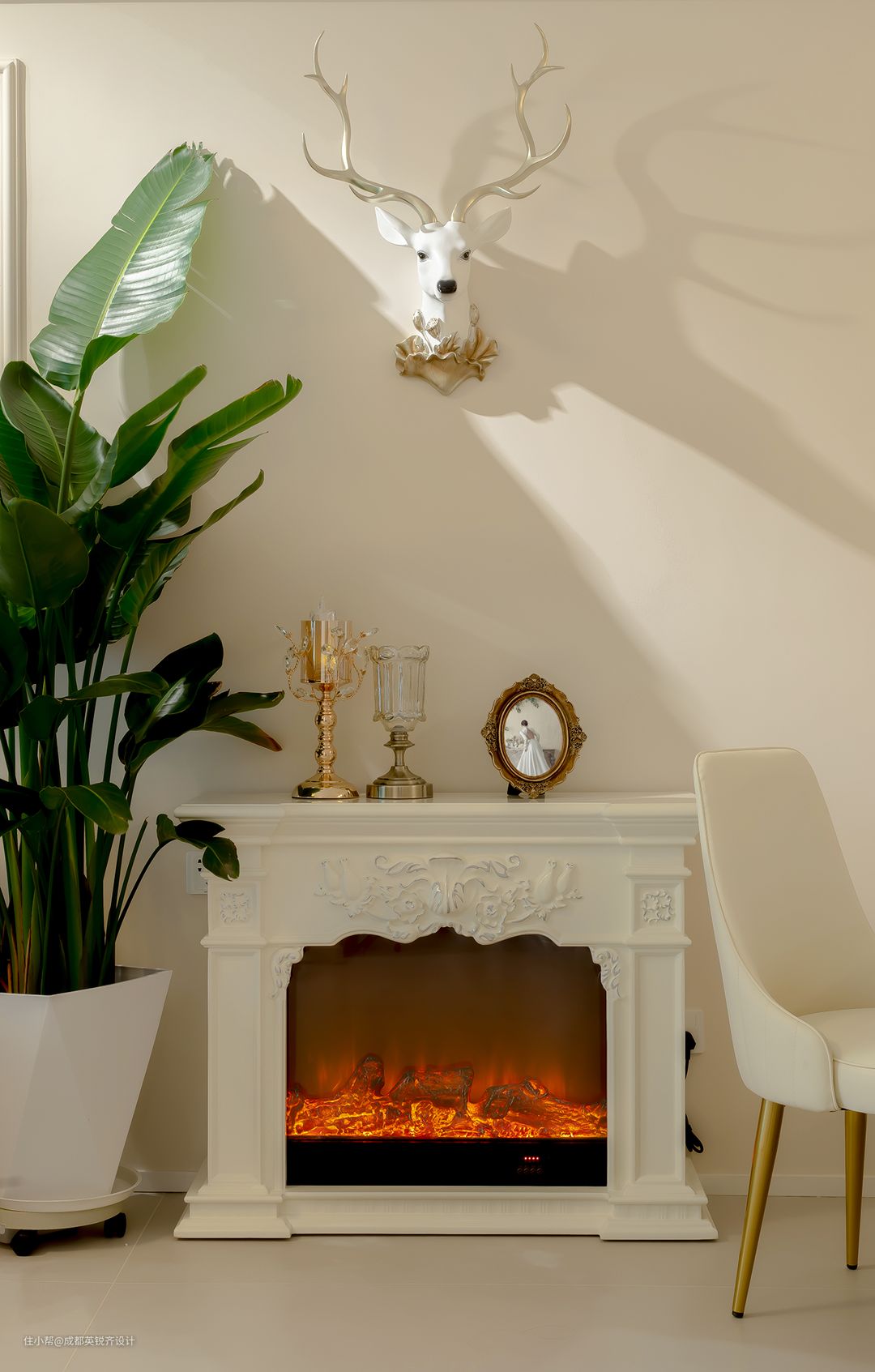 棕色墙面有了石膏线的加入增添了不少立体度 搭配低饱和度的颜色打造出不一样的视觉体验
