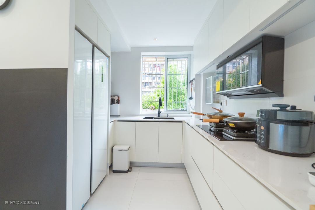 玄关另一侧便是厨房区,原本的墙体拆除外拓,设计了一个U字型的开放式厨房,双开门冰箱也被放置在这里。