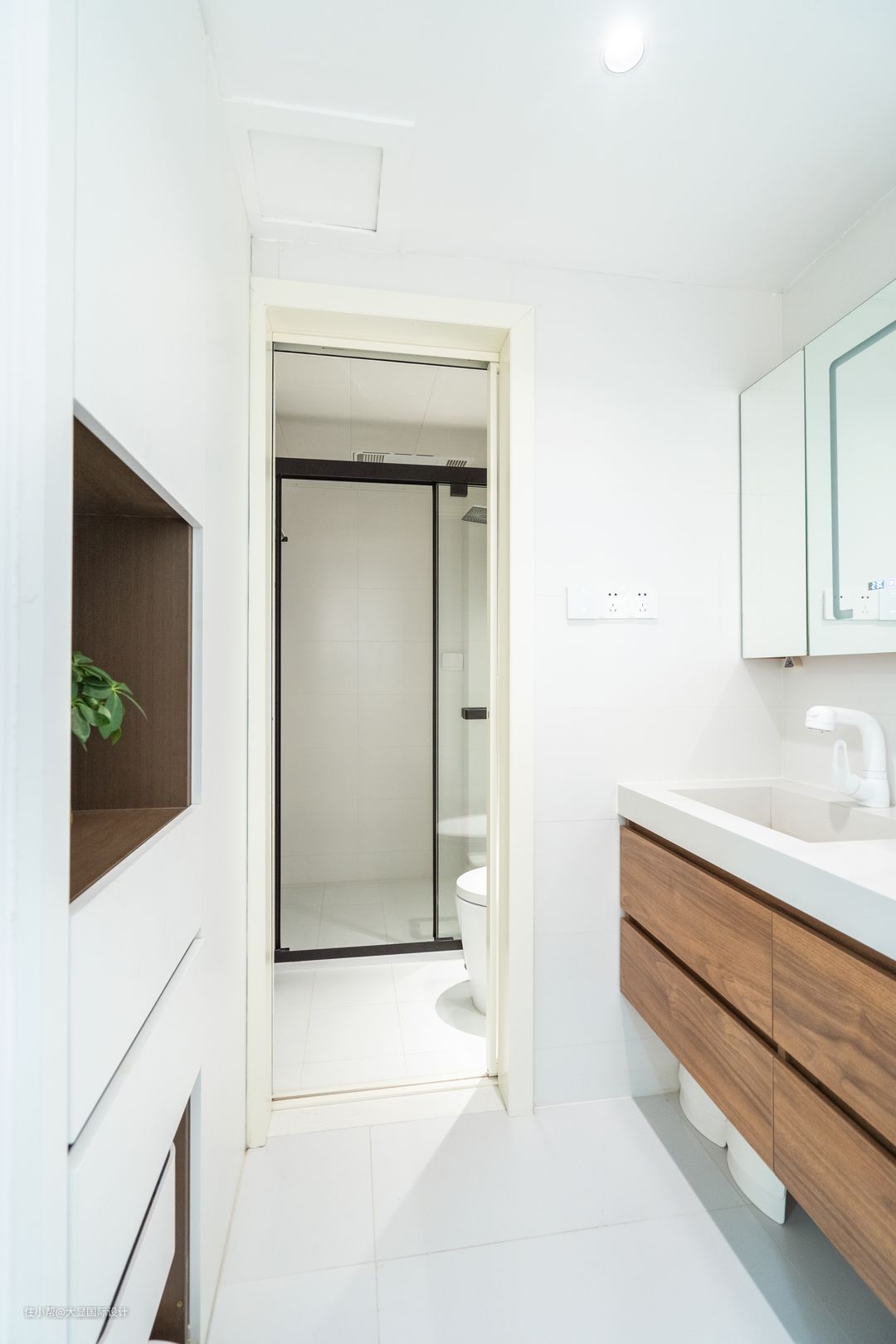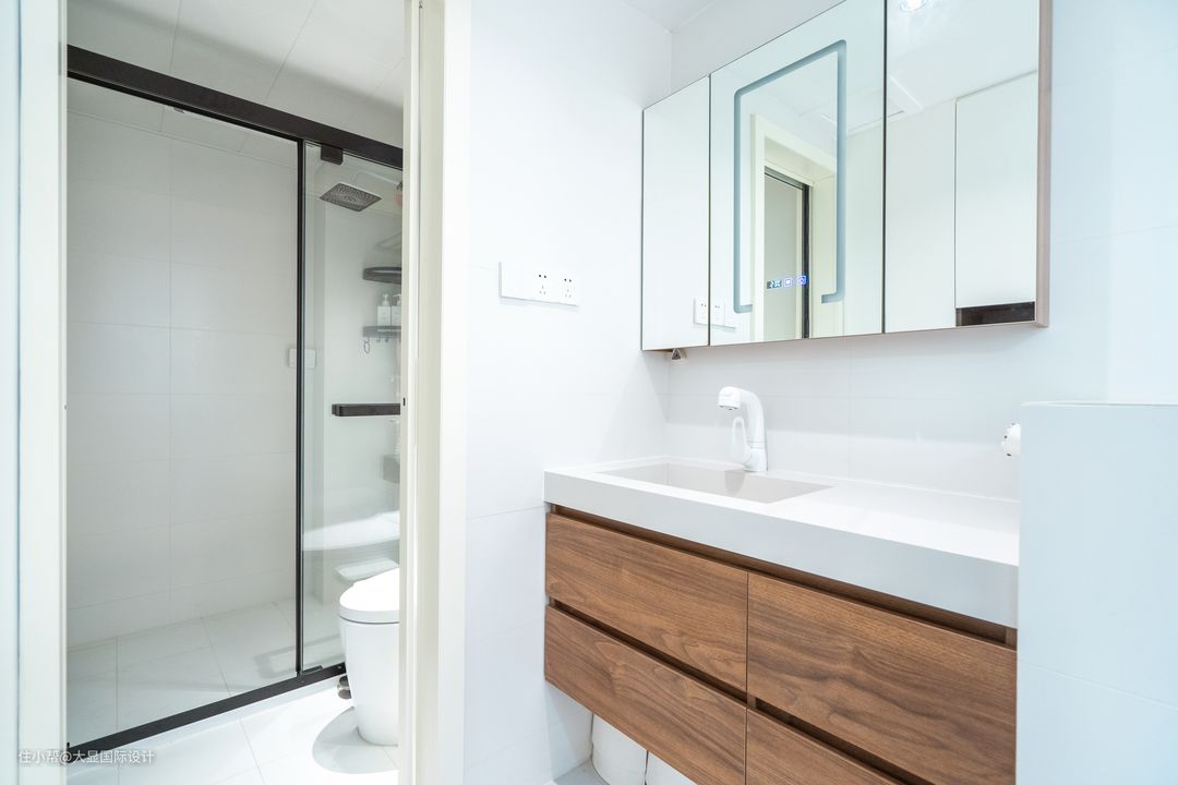 卫生间毗邻主卧,干湿三分离的设计,让空间利用率得到了最高,洗漱干区外置,身后的储藏柜也增添了不少的储物空间。