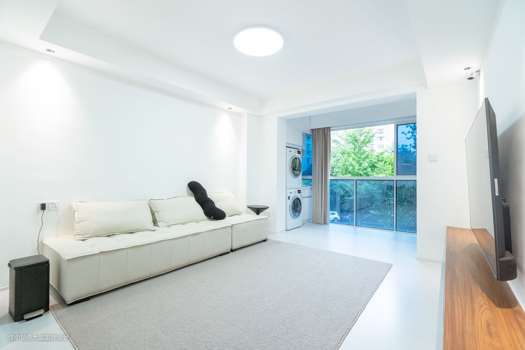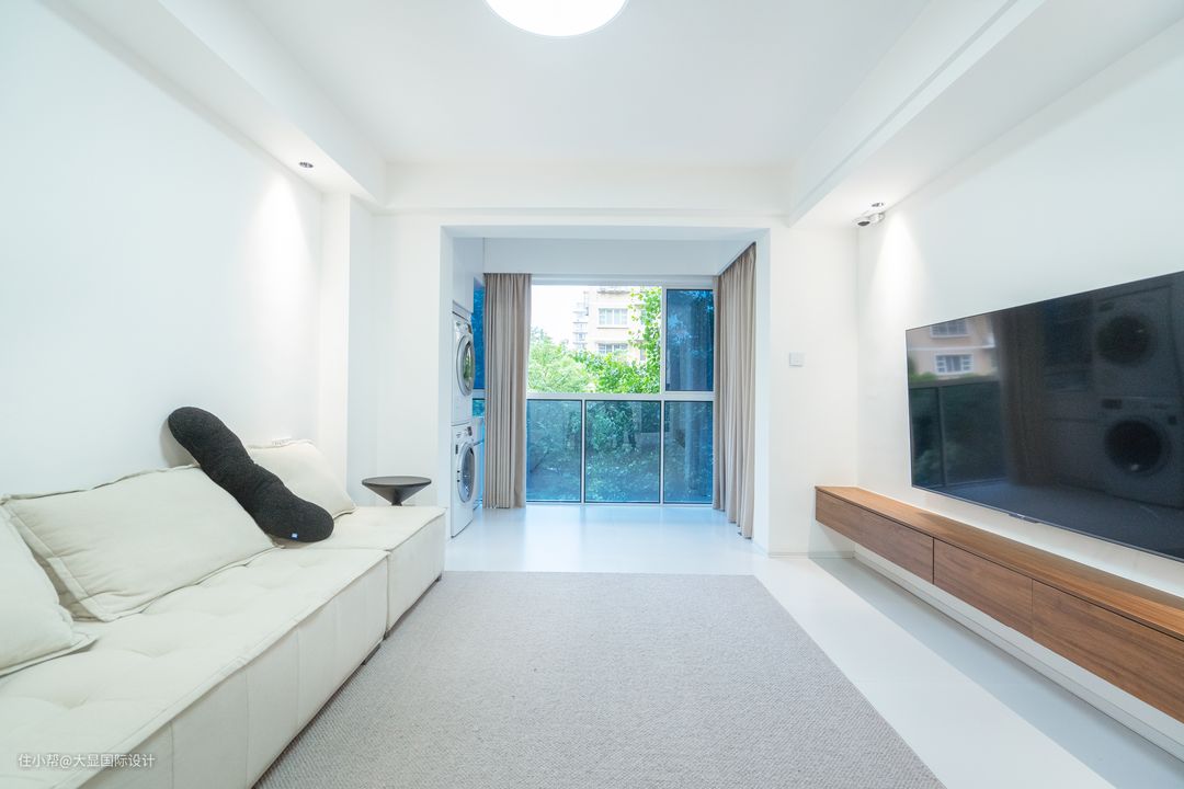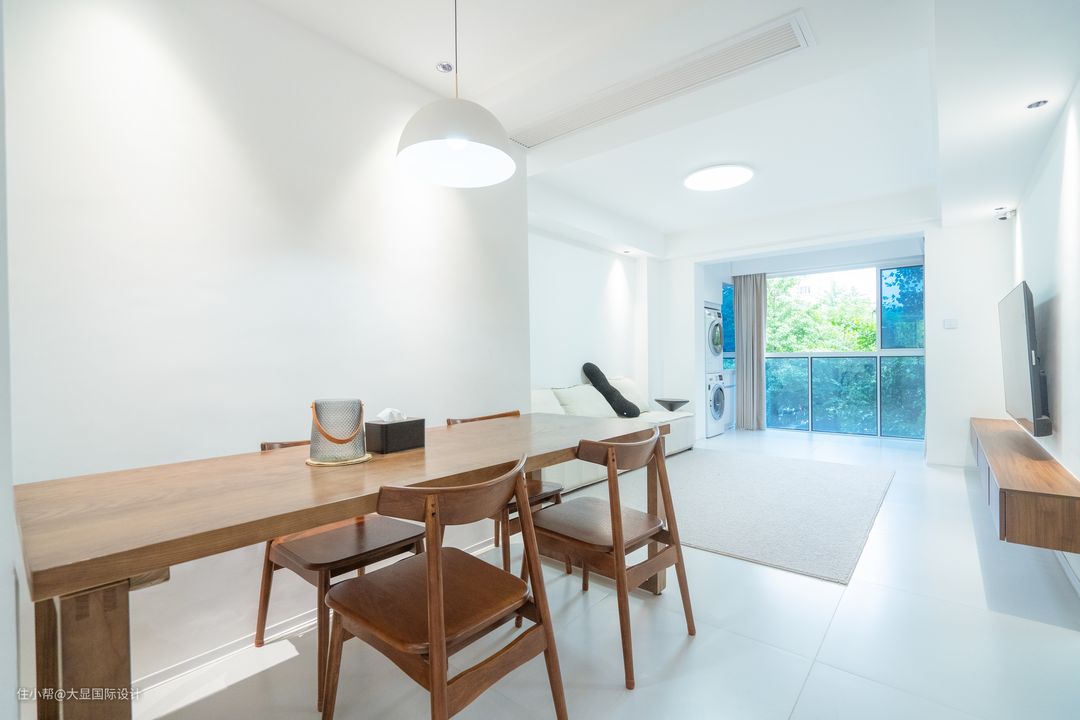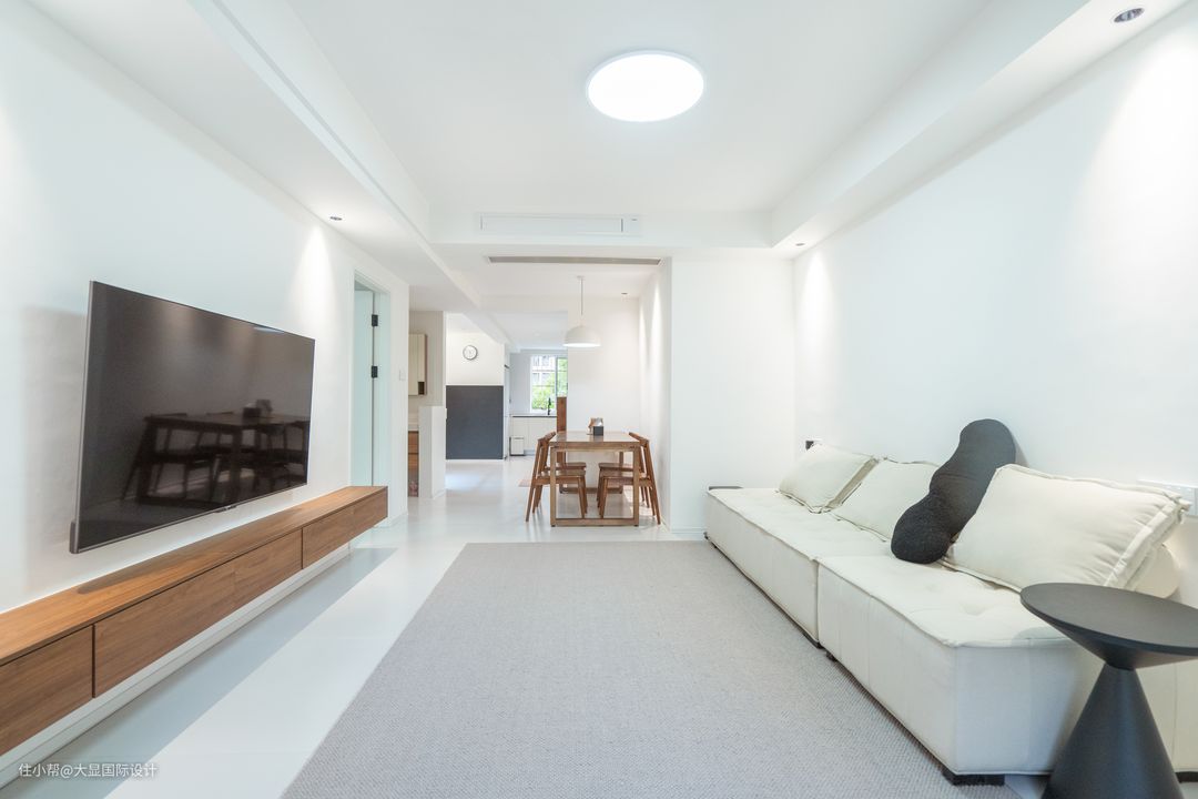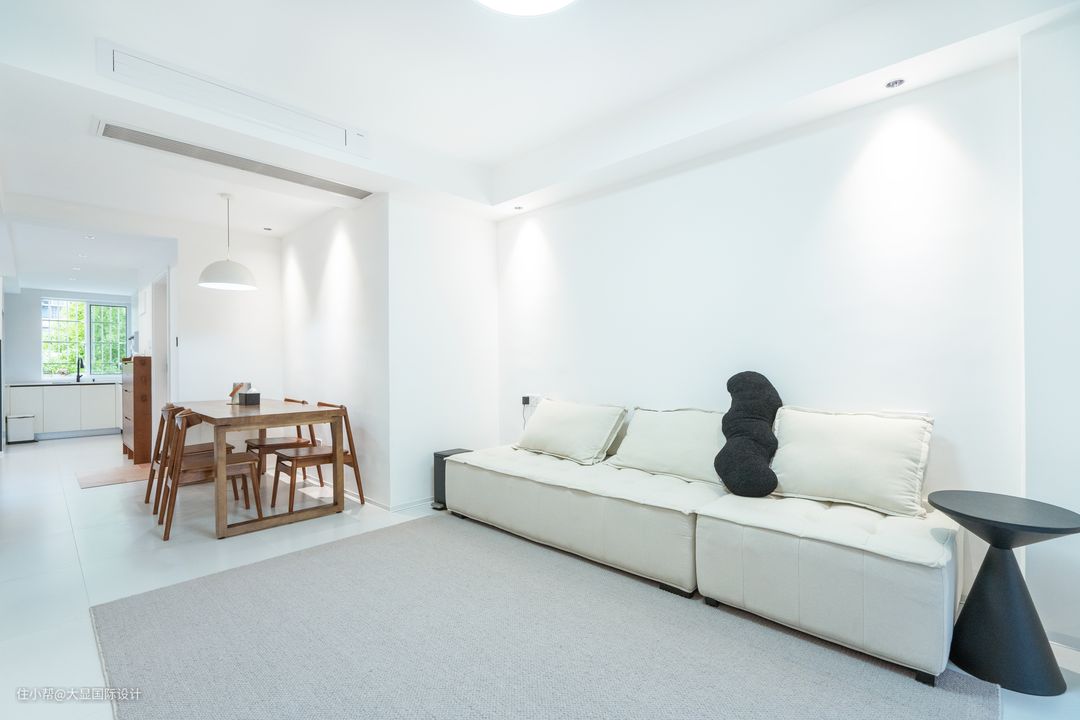 黑白灰是极简风的主色调,不需高饱和色彩,也能呈现高级美感。客餐厅直接用大面积白灰色相搭配,呈现干净空灵的气质。