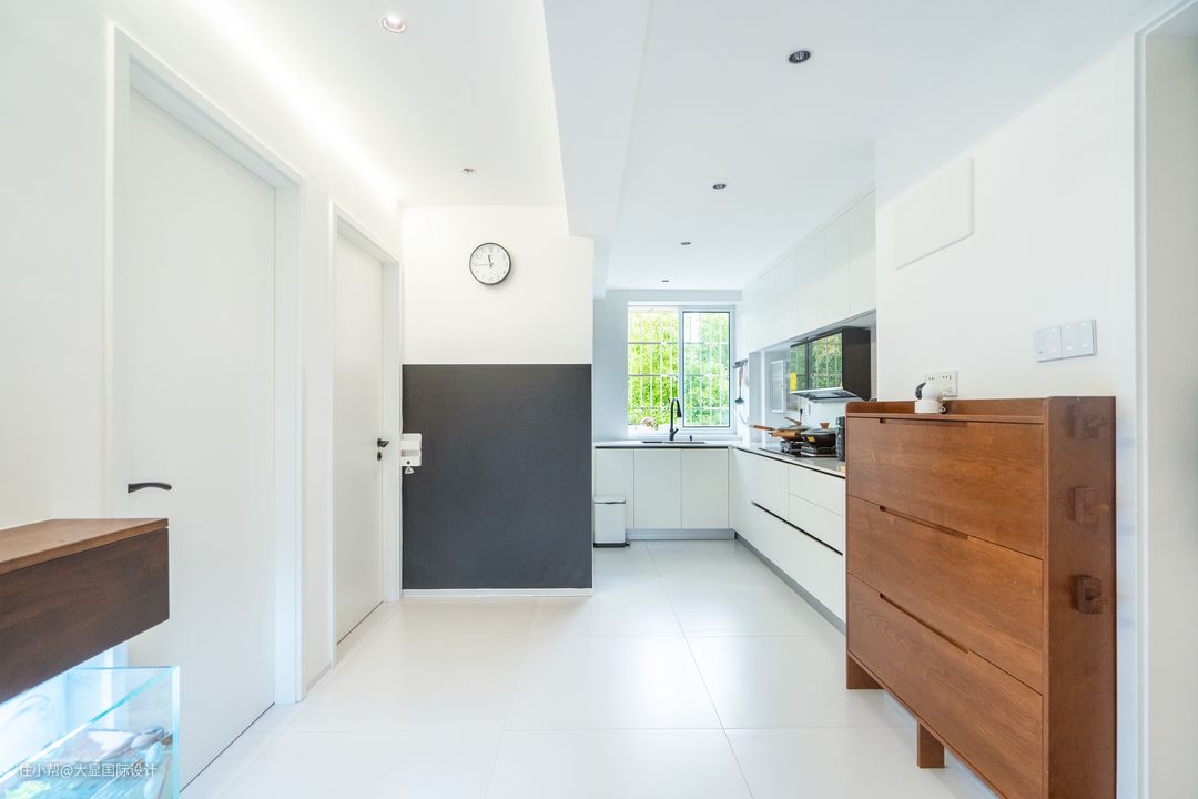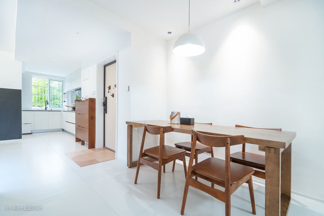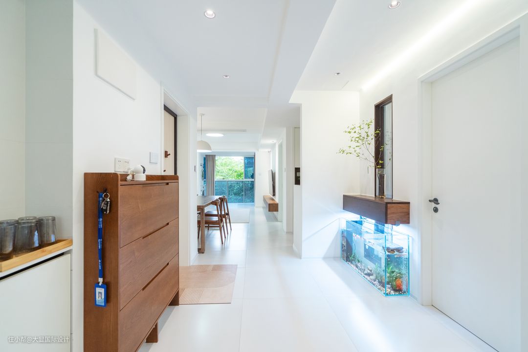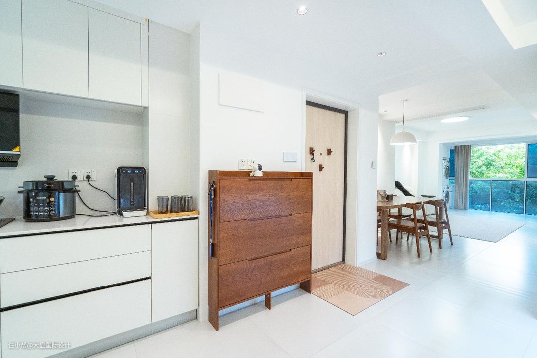 整屋墙体拆改,重新规划后,南北通透的格局,让采光更为明亮,门边设计了一个胡桃木半柜用以储藏,极简清爽的家从玄关开始。