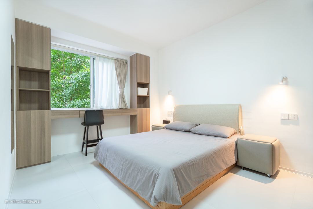 床头柜与床头同样运用了软包设计,显得更为温馨,床头还做上了壁灯设计,可移动的光源带来了更多的生活可能性。 沿窗贴墙设计了一排办公书桌柜,这里也是女主人阅读、办公、游戏、收纳、梳妆的多功能休闲区,呈现美好的生活化场景。