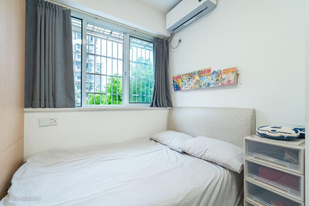 业主的孩子在上小学,阅读范围却很广;儿童房的面积局促,于是我们贴合空间设计了柜体收纳+榻榻米床,满足孩子学习、生活、储物的需求。