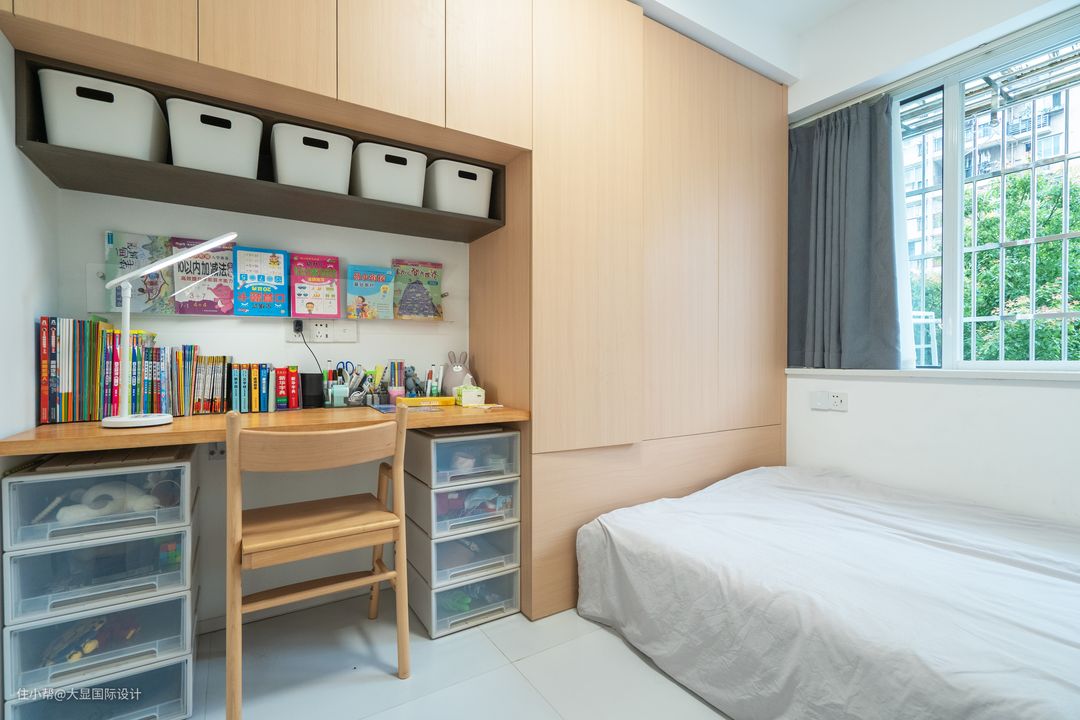 床尾做了整排衣柜用以储物连通书桌,空间以原木色为主,相较其他空间而言更显活泼温馨,充满童趣。