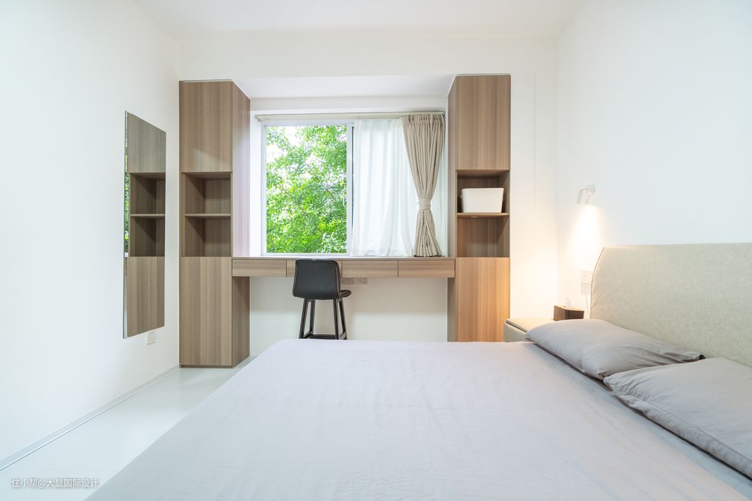 没有过多的装饰,但奶油色的窗帘、纱帘与整体的原木色调,却能给人最简单的安心,这一觉睡去,定是一场美梦。