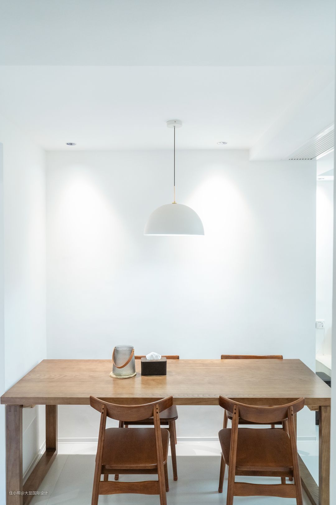 墙面留白,仅以一盏简约的餐灯点缀,与温润的胡桃木餐桌椅呼应。同时配以色温3000K的射灯做氛围灯光,营造空间轻柔温馨之感。