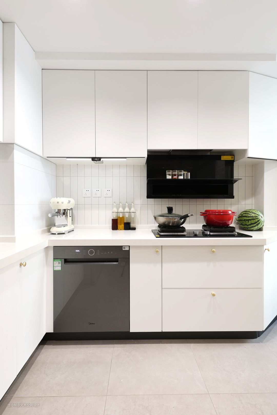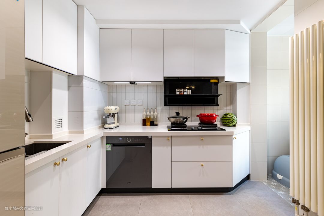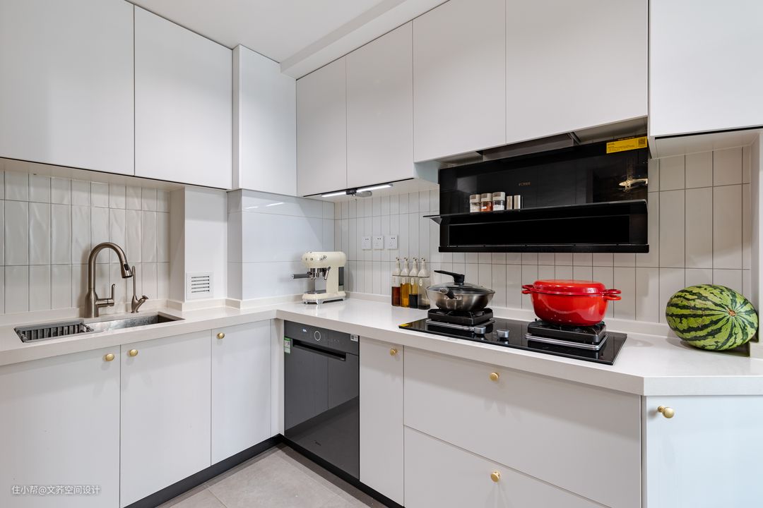 整个厨房的洗切炒动线明确,操作空间明亮又宽敞。纯白色的橱柜搭配白色的墙砖,干净而美好。远远看过去,就像一个整体,在阳光的照射下,更是带来不一样的烟火气息。 #厨房#洗手台#抽油烟机#墙砖