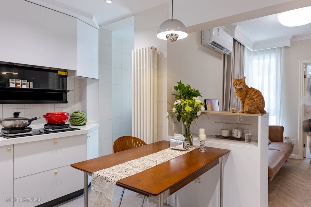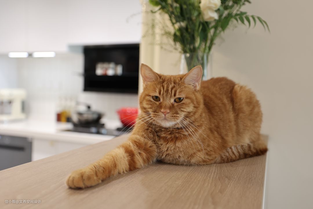 在餐桌旁放置白色储物柜,分离餐厅与客厅的空间,也帮助屋主收纳小物品,更是猫咪的小天地。可爱的大橘慵懒地趴在柜子上,生活气息满满,一个人也不觉得孤单。 #餐厅#储物柜#原木贴纸