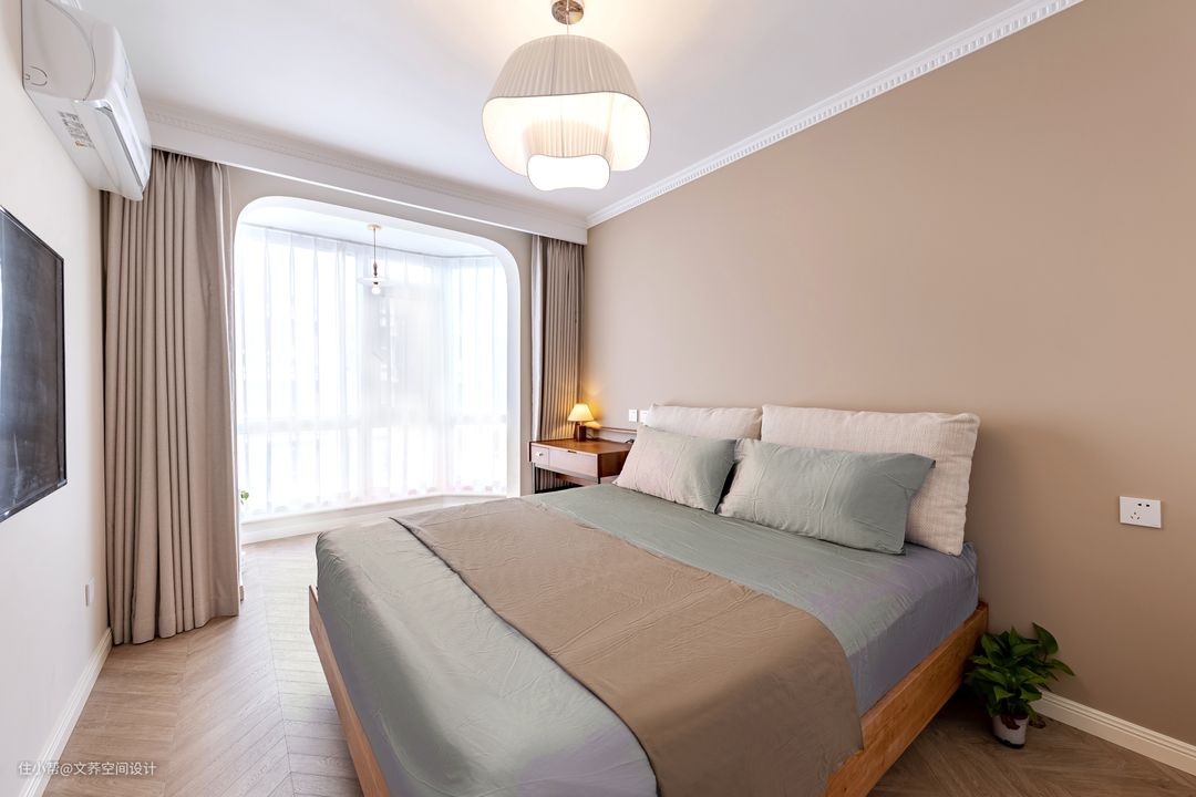 卧室的墙壁漆成米白色,黑色的液晶电视挂在墙面,简洁不显突兀。原木的地板也为房间增加了舒适的气息。与阳台相连,空间自由度高,将阳台设计成多功能阳台,不仅使屋内光线充足,也让卧室更加宽敞大气。 #卧室#墙面#电视机