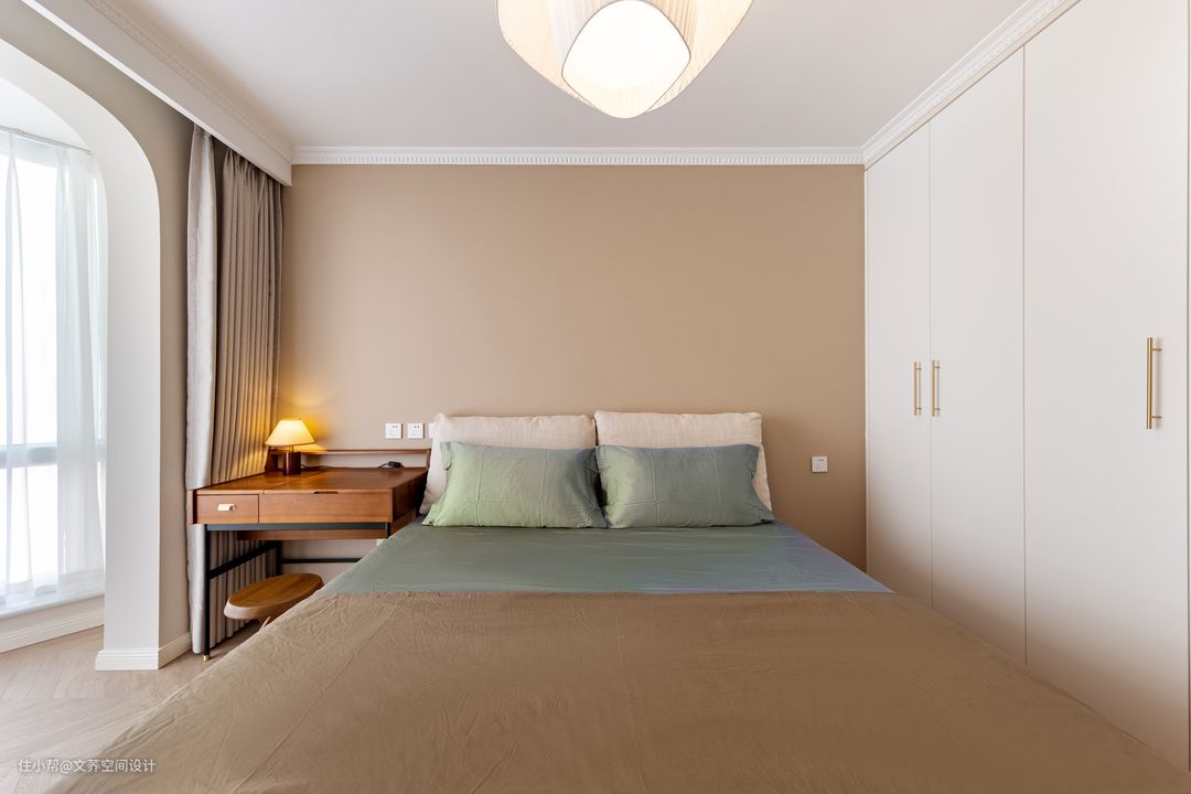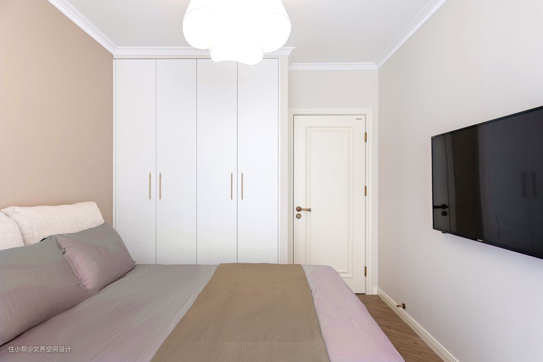 卧室左侧墙面是一扇米白色的木门,木门旁设计出一个贴墙的雪白衣柜。门和衣柜在色彩的变化是房间视觉效果上更加多元化,更具青春的气息。 #床头柜#卧室#衣柜