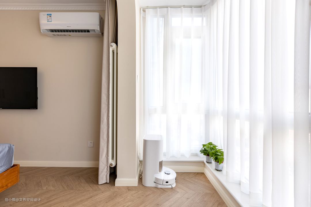 多功能阳台与卧室的结合可谓让人眼前一亮,整体给人窗明几净之感,透气性良好,光照充足,是人梦想的小家。一处小小的隔断划分了它与卧室的功能区间,但并不明显。扫地机器人的存在让家居更智能化,在这儿作为机器人的栖息处再好不过了。 #多工能阳台#地板#扫地机器人