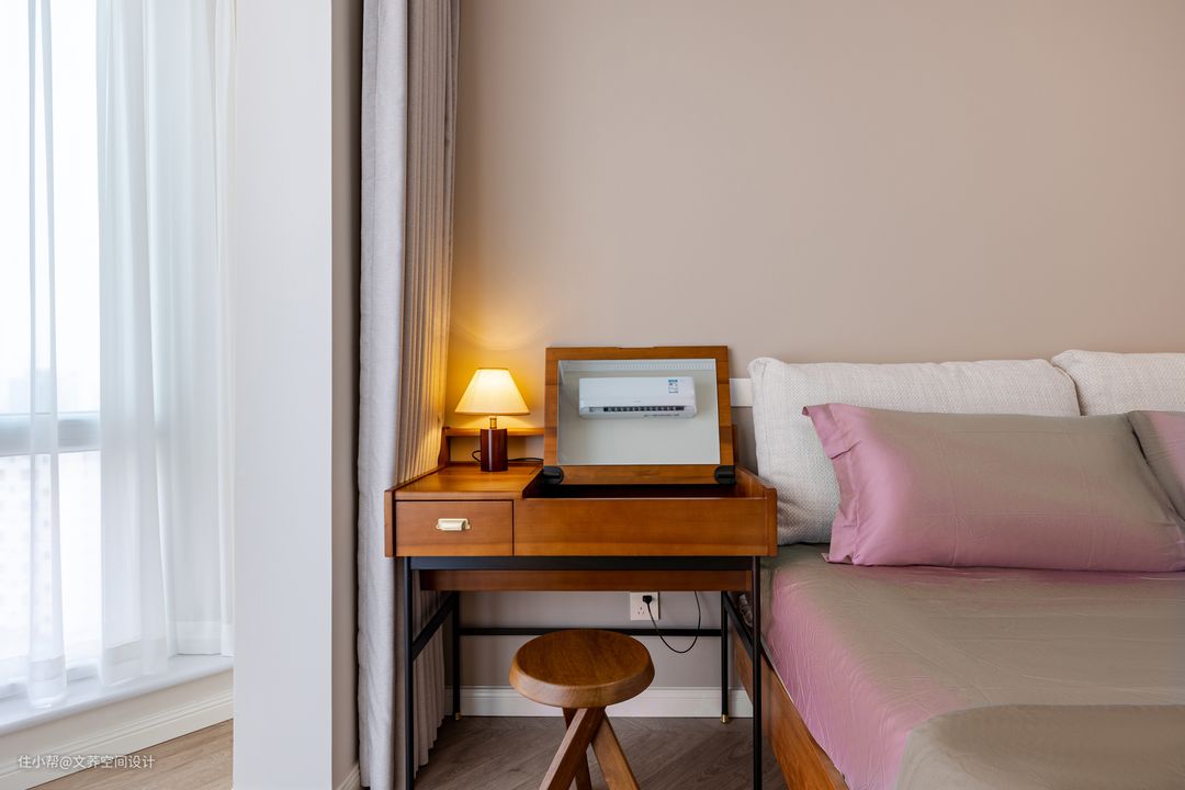 床头柜设计别具匠心,说是床头柜,其作用更像是一个小桌子。底部镂空,放置一把椅子,原木的色调也凸显一股神秘深沉感。 #卧室#床头柜#化妆桌
