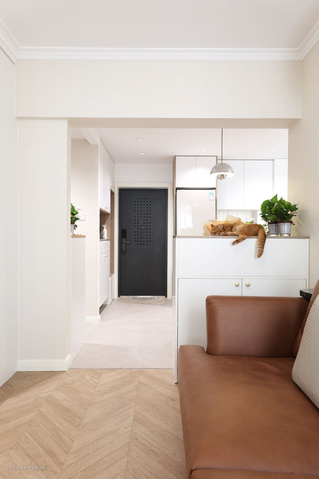 首先,玄关是与客厅直接连接的,这样会使空间在视觉效果上更加宽敞,也巧妙地消除房间狭长的缺点。在色彩搭配上,玄关处与客厅间运用大面积的白色,大量的白色使空间在视觉上不显拥挤的同时也让整个空间更加干净透亮。 #玄关#橱柜#地板#吊灯
