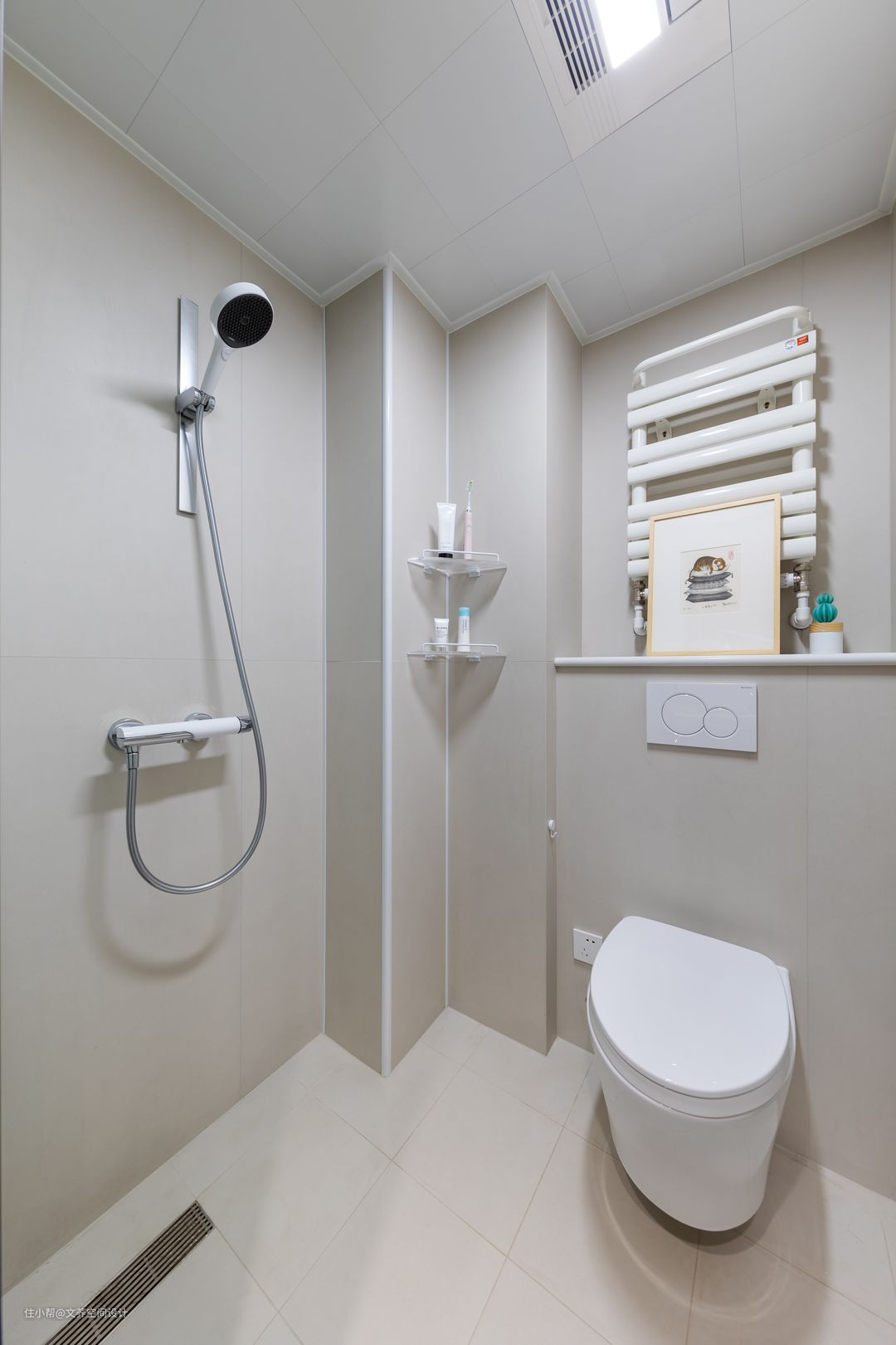卫生间以浅灰调为主,没有深灰的冷清与沉稳也没有白色的过份纯静,浅色的恰恰给人恰到好处的舒适。 #卫生间#置物架#墙砖