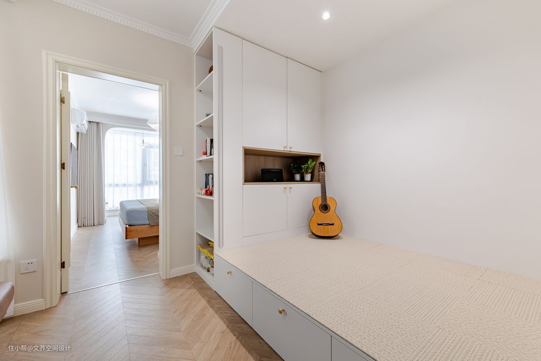 把右侧多出面积设计为橱柜,摆放装饰品或收纳,增加生活气息,合理加入多处收纳空间,让小户型也能更简洁更舒心。内部墙面的嵌入式镂空处,缓解了视觉疲劳也使空间不显死板。 #榻榻米#吉他#收纳柜