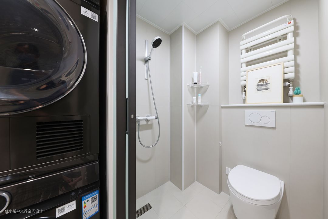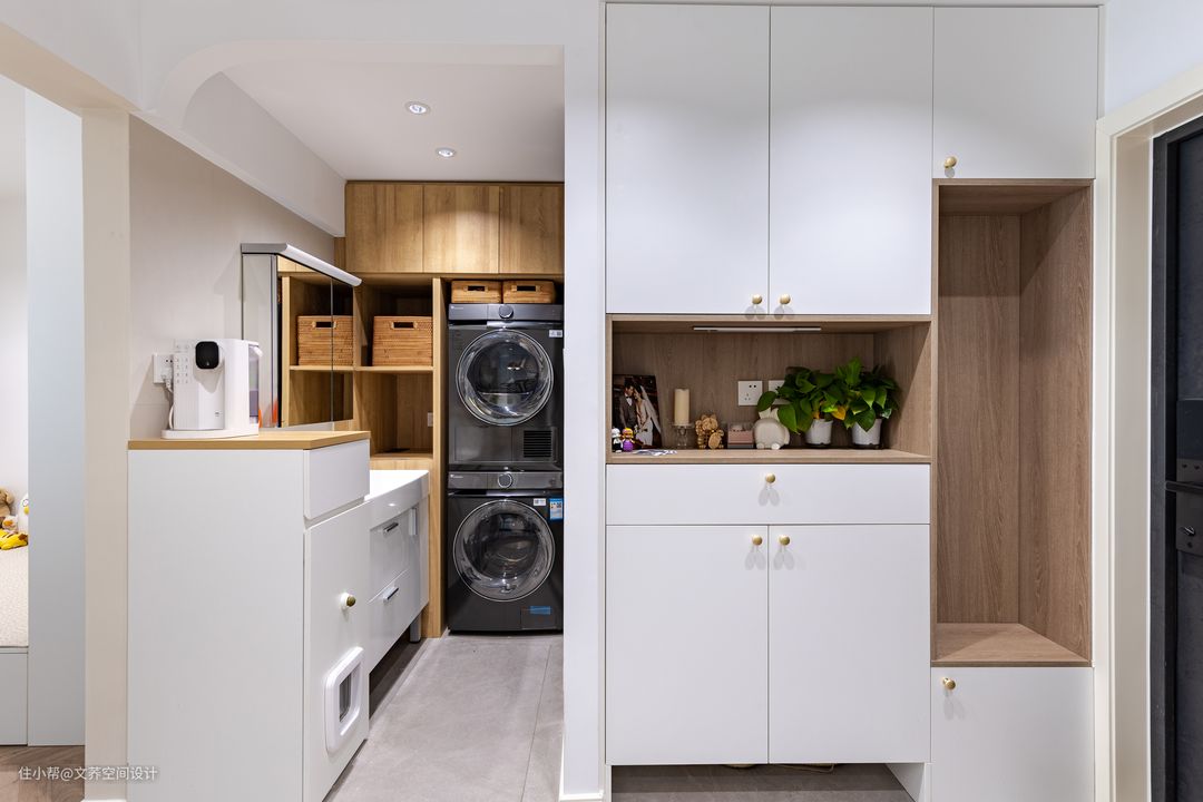 玄关处可谓是展现了什么叫麻雀虽小,五脏俱全的特征了。首先在进门的右手边增加通顶的储物柜设计,预留出挂衣区以及小物件的摆放区域,使房间更具生活气息。另外在柜体下方还预留出20公分摆放鞋子的区域,方便业主回家换鞋的同时,还不影响扫地机器人打扫。 #玄关#收纳柜#洗衣区#洗漱区