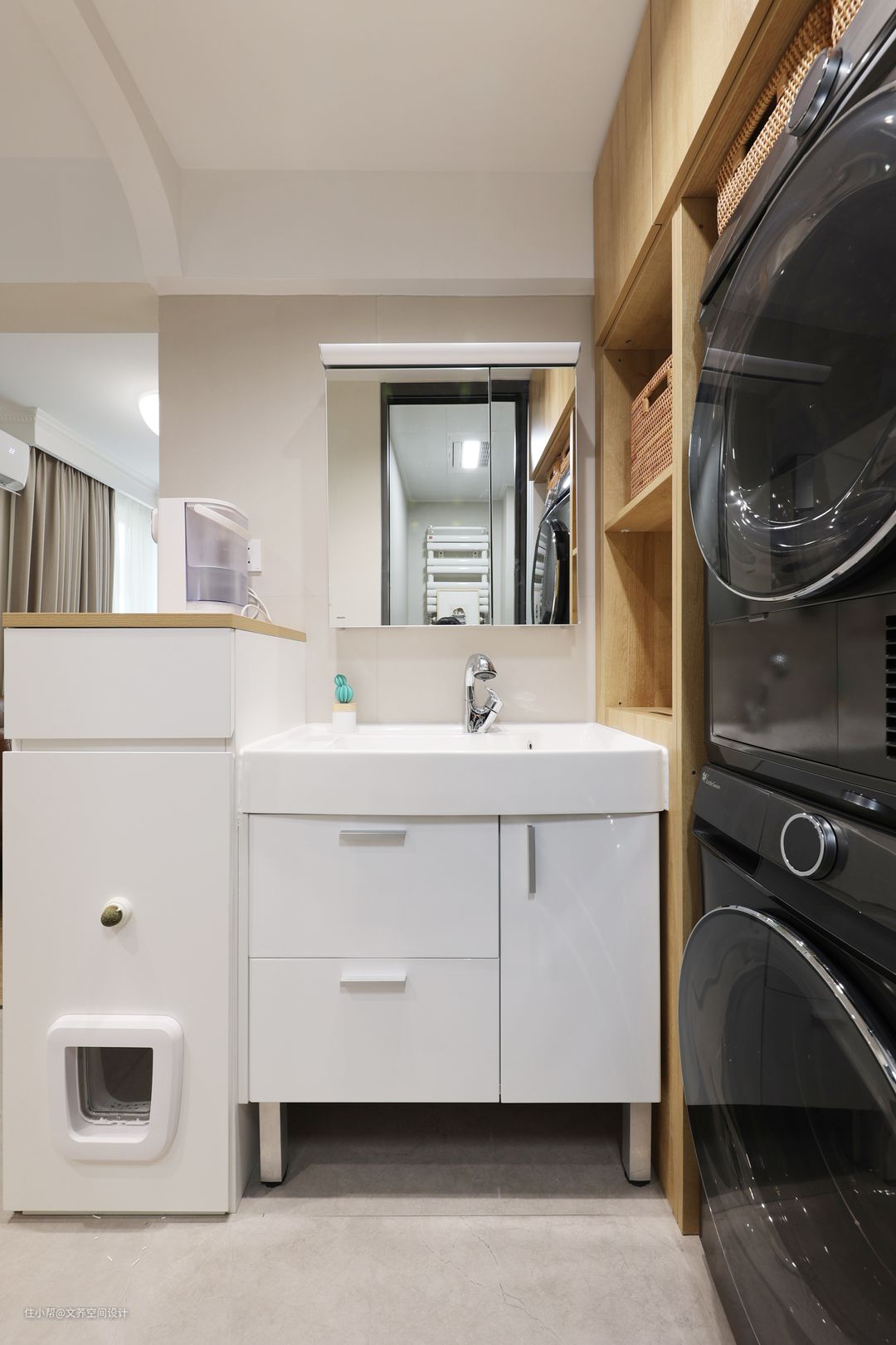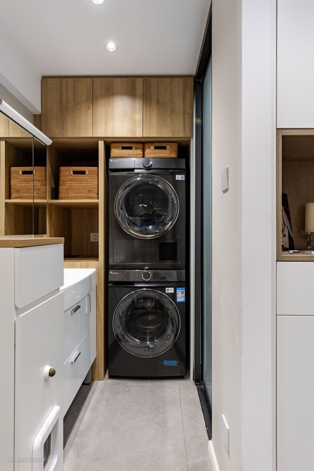 将滚筒洗衣机上下放置在柜中,节省房屋空间。原木的嵌入式收纳柜,温暖方便。 #洗衣机#烘干机#洗漱区
