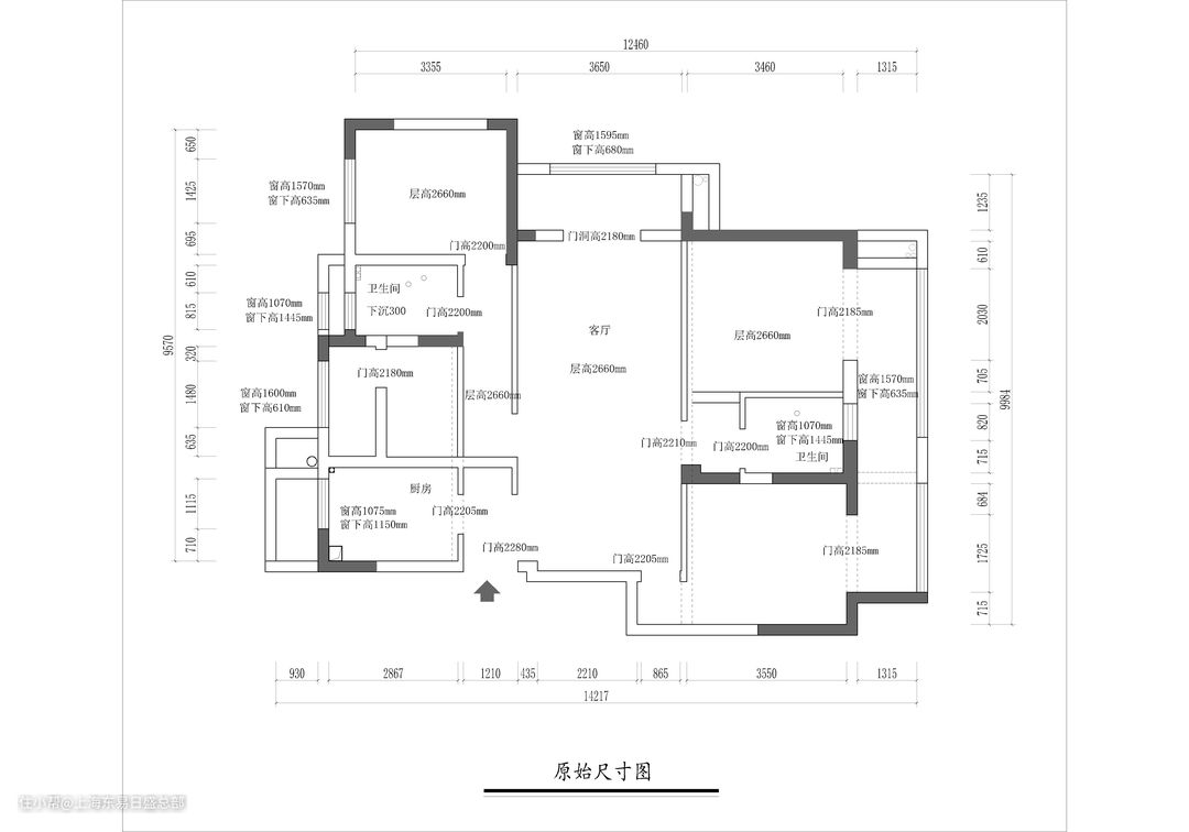 ▲平面布局图 原本的户型墙体隔断较多,影响整体采光和通透度,两个卫生间的设计对于一家三口来说实用性也不强,所以我们做了几点改动: (1)厨房改开合门为玻璃推拉门,保证通透敞亮的视觉空间; (2)主卫空间拆除,保证实际使用面积,增加储物和收纳空间; (3)书房我拆掉多余的隔墙,保证舒适采光和动线。