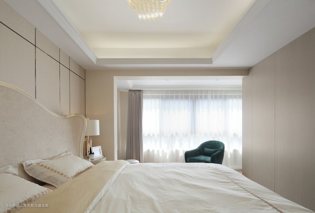 主卧我们选用了香槟色的空间基调,呈现静谧雅致的睡眠空间。床头背景墙使用护墙板做拼接处理,简洁大气。选用了舒适的高床头靠背,优雅的曲面造型呈现更加舒惬的h视觉体验。阳台空间打通,保证舒适敞亮的视觉空间,放置复古色调的单椅,打造女主人专属的休闲空间。