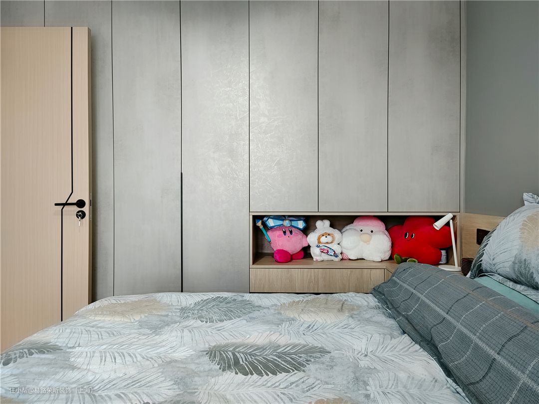 卧室以灰色与木色作为主基调,墙面选用了灰色的乳胶漆,床头背景采用衣柜+床头柜组合式,一半灰色,一半原木色,成为卧室设计的点睛之笔,简约却富有层次。