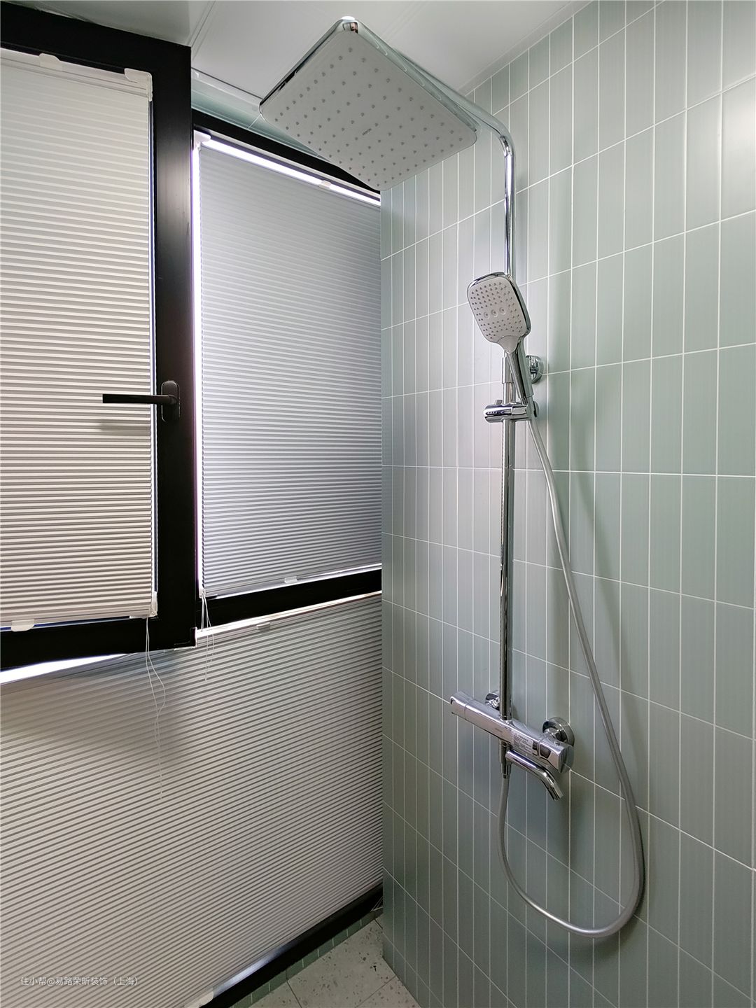 卫生间地面铺设防滑的仿古砖 ,墙面洗漱区与如厕区暖灰色的釉面砖,简洁耐看,而淋浴区墙面则搭配清新绿的艺术砖,清爽又有质感。