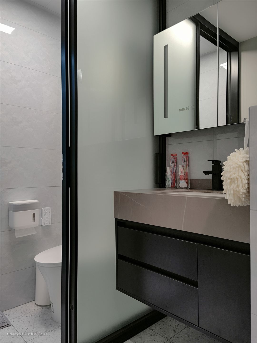 洗漱区采用半墙+长虹玻璃设计,既保持私密性,又增加透光效果,壁挂浴室柜加上镜柜能收纳不少东西;