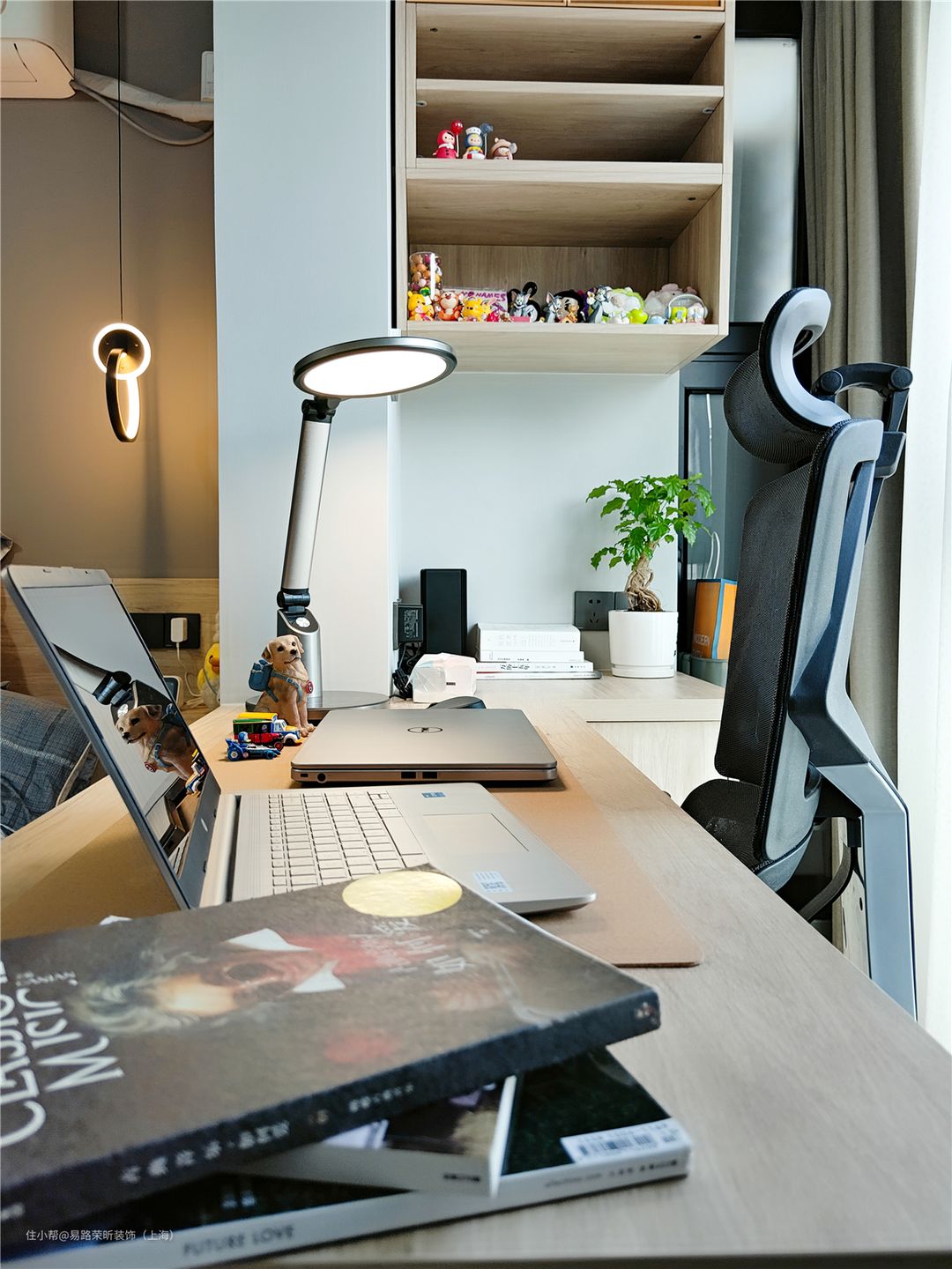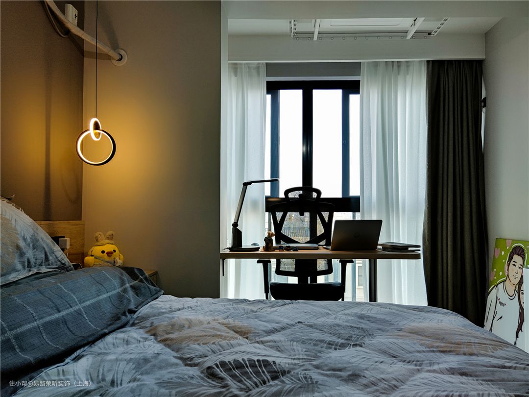 当空间受限时,可以把目光投向阳台,打通卧室阳台,空间变大不少,利用阳台垭口设计L型悬空书桌+收纳,清理卫生方便省事;一侧打造一组置物架和地柜,像手办、书籍、工具等都可以收纳在这里了,对于小面积卧室来说,简直不要太合适,空间物尽其用,打造强大的功能性。