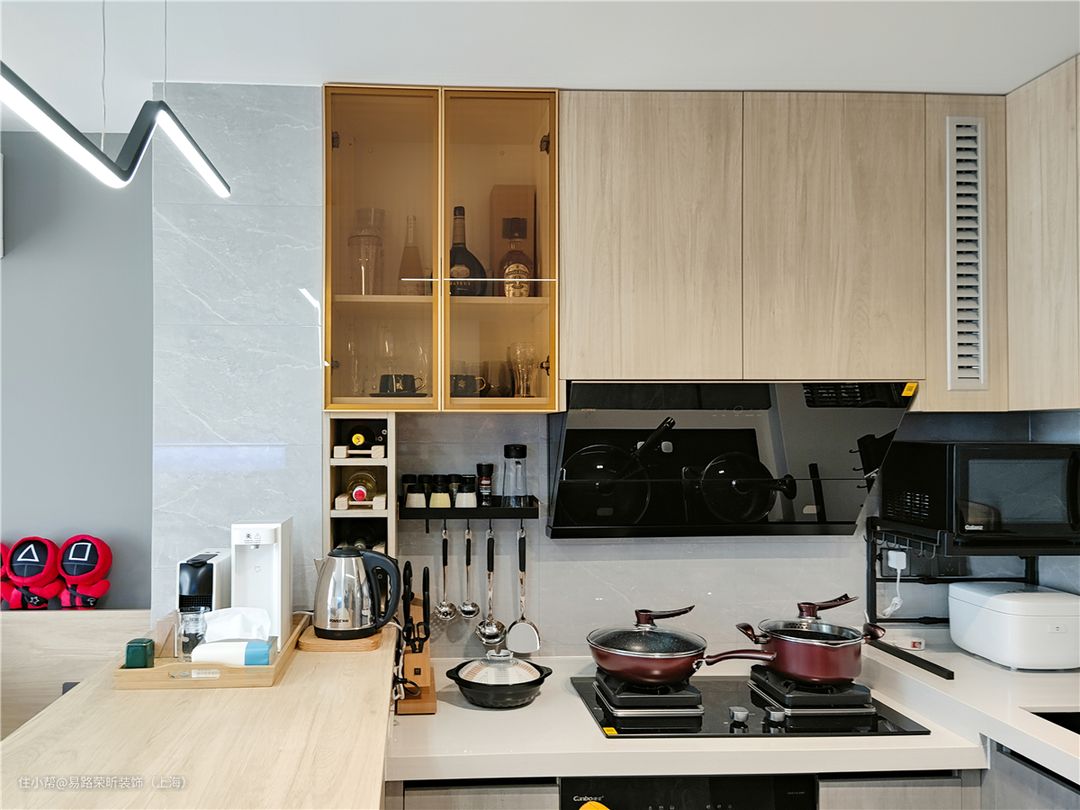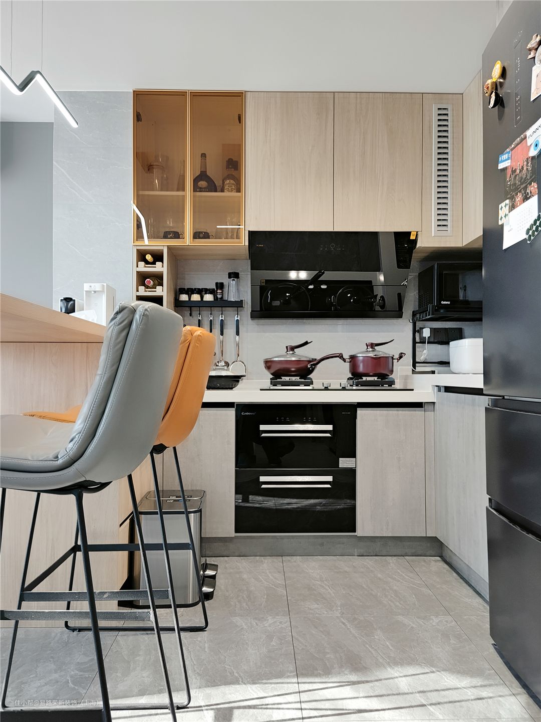 厨房色调:灰色+原木色。墙地面选择灰色瓷砖,厨房用品和电器主要选择深色系,橱柜以灰色地柜与木色吊柜搭配,简单又不失质感,免拉手柜门设计便于卫生清洁,置物架存放各种调味品和小电器,也符合屋主追求的大方简洁,灶台高度和水槽高度一定要做成高低台面,非常舒适。