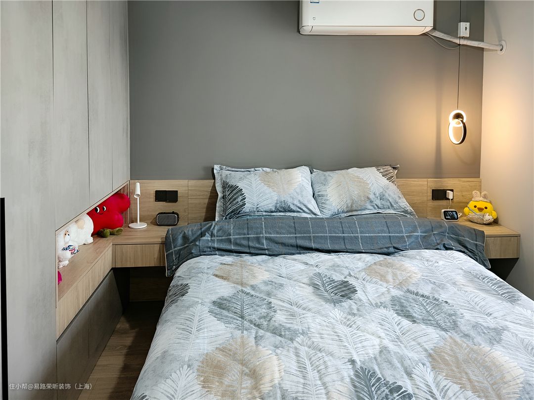 卧室以灰色与木色作为主基调,墙面选用了灰色的乳胶漆,床头背景采用衣柜+床头柜组合式,一半灰色,一半原木色,成为卧室设计的点睛之笔,简约却富有层次。