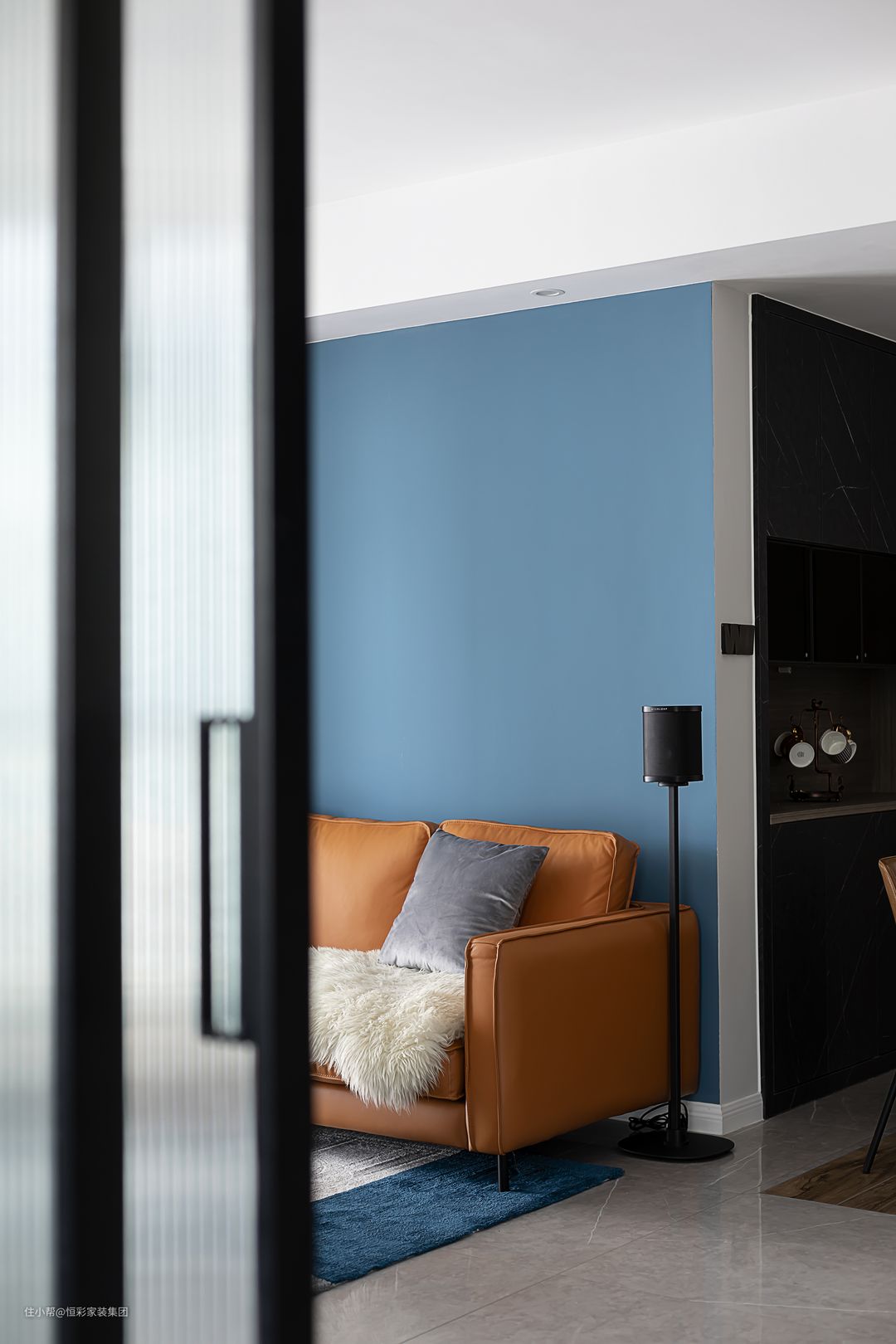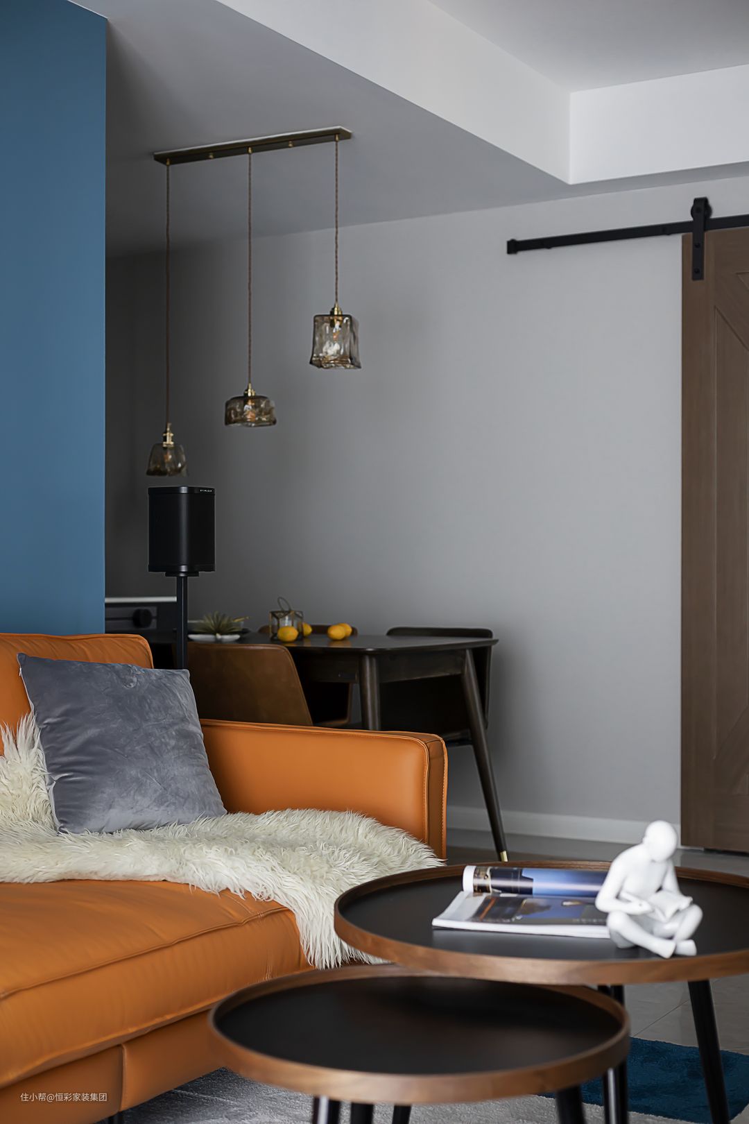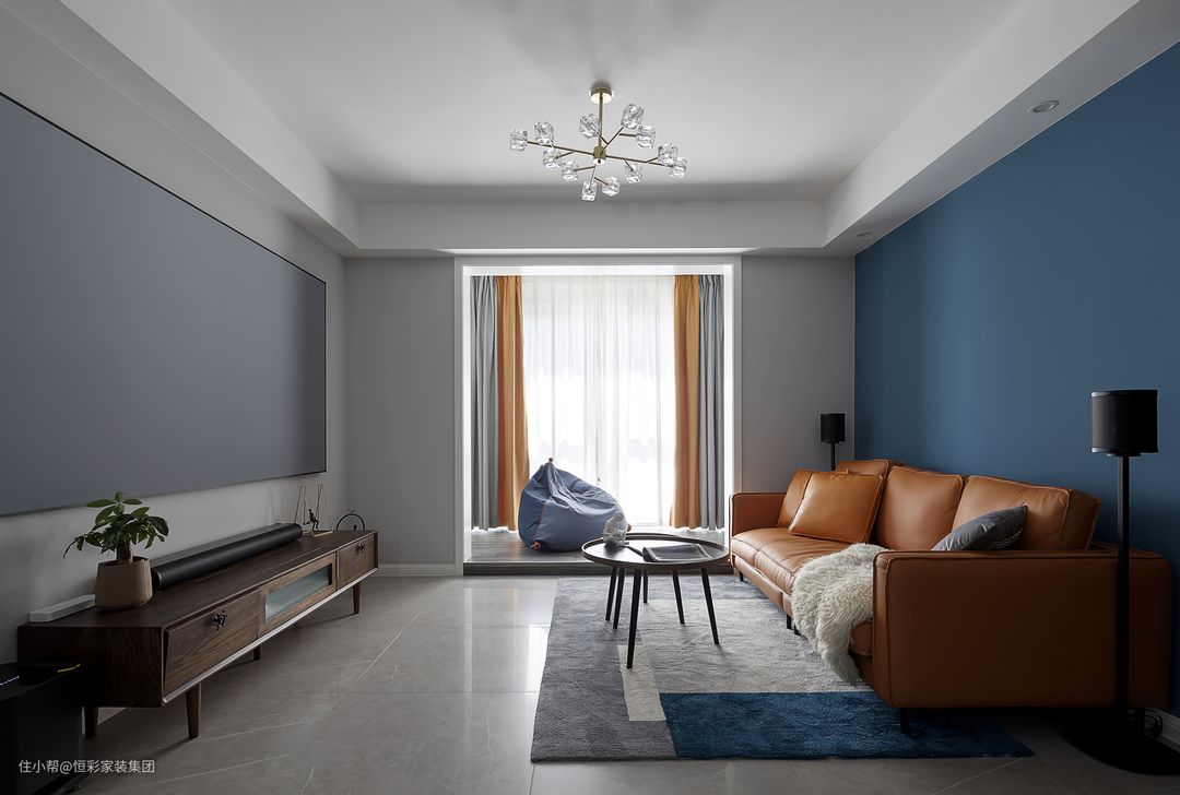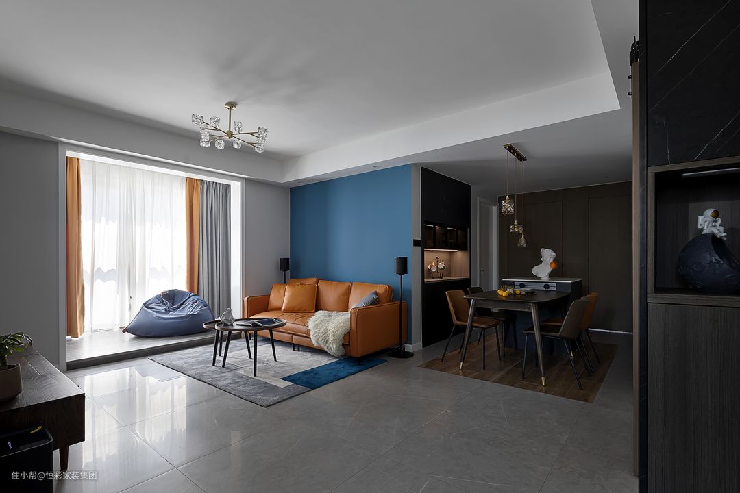 看腻了“黑白灰”的平淡无味,屋主和设计师达成共识,在用色方面很是大胆,沙发背景墙以大面积的深蓝色块铺刷,和最佳拍档色橙色,一冷一暖的撞色,让空间感和色彩秩序感分明。