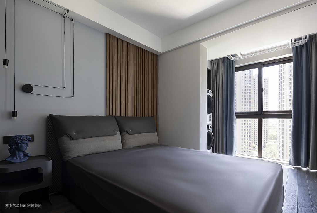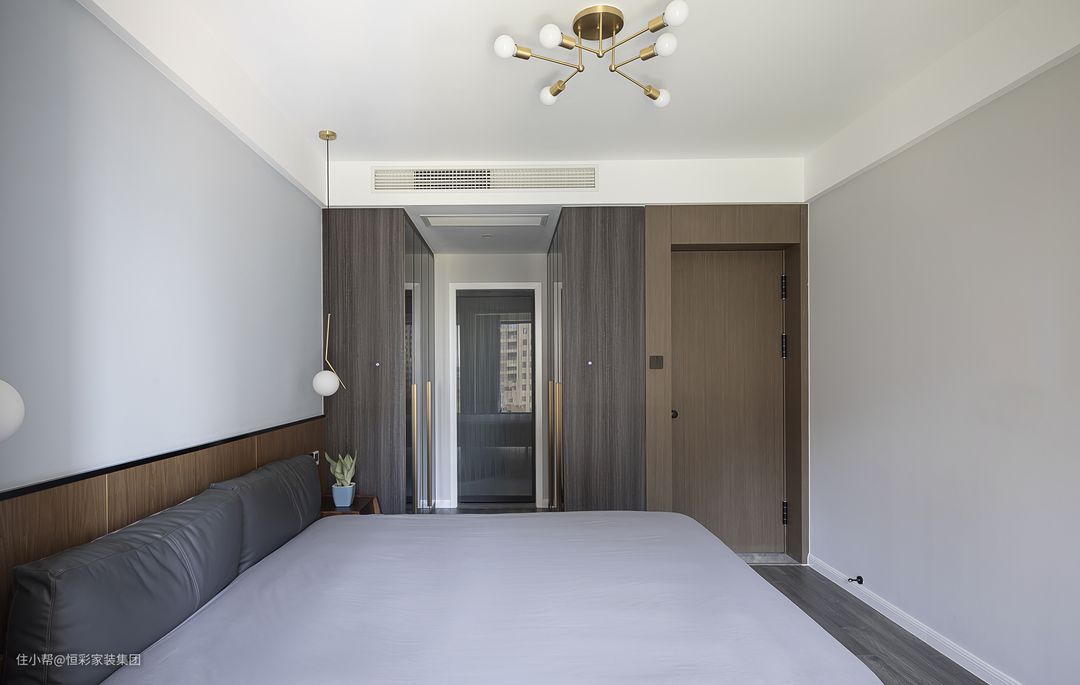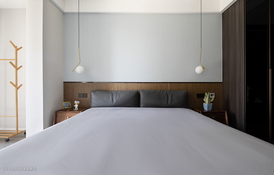 阳台包进卧室后,卧室面积缩水的问题也就迎刃而解。背景用木饰面板做半高硬包处理,充当床头,两边搭配对称的床头吊灯和床头柜,规整有序。
