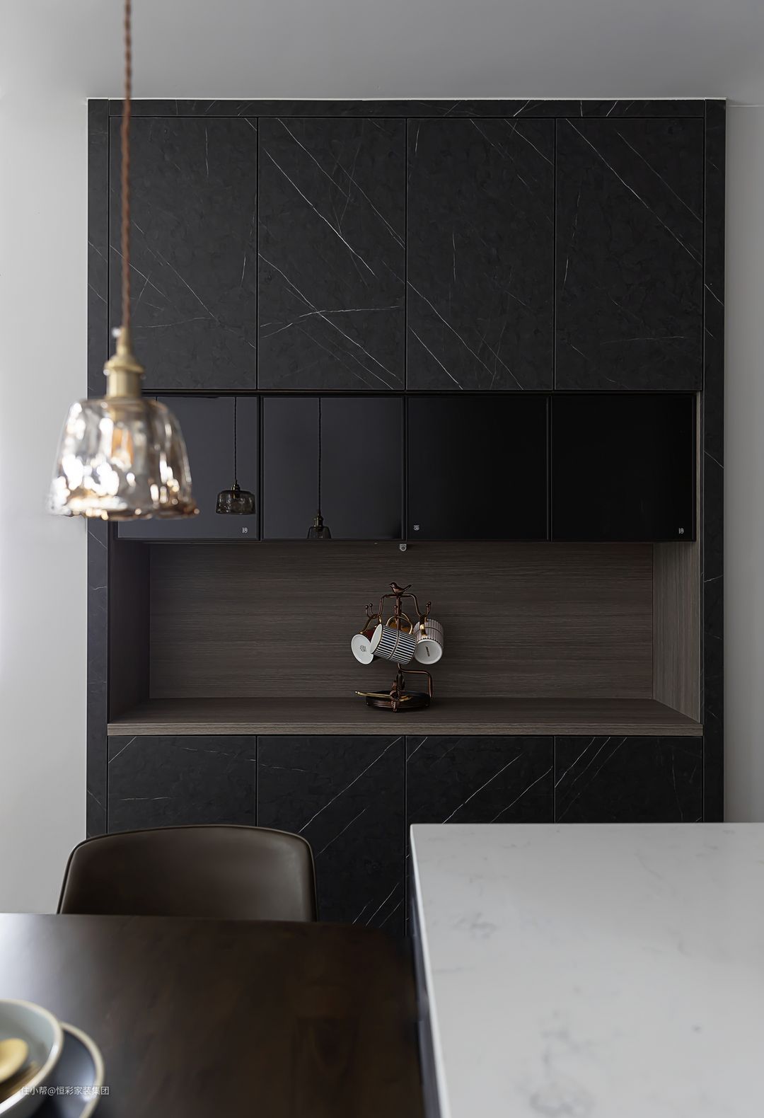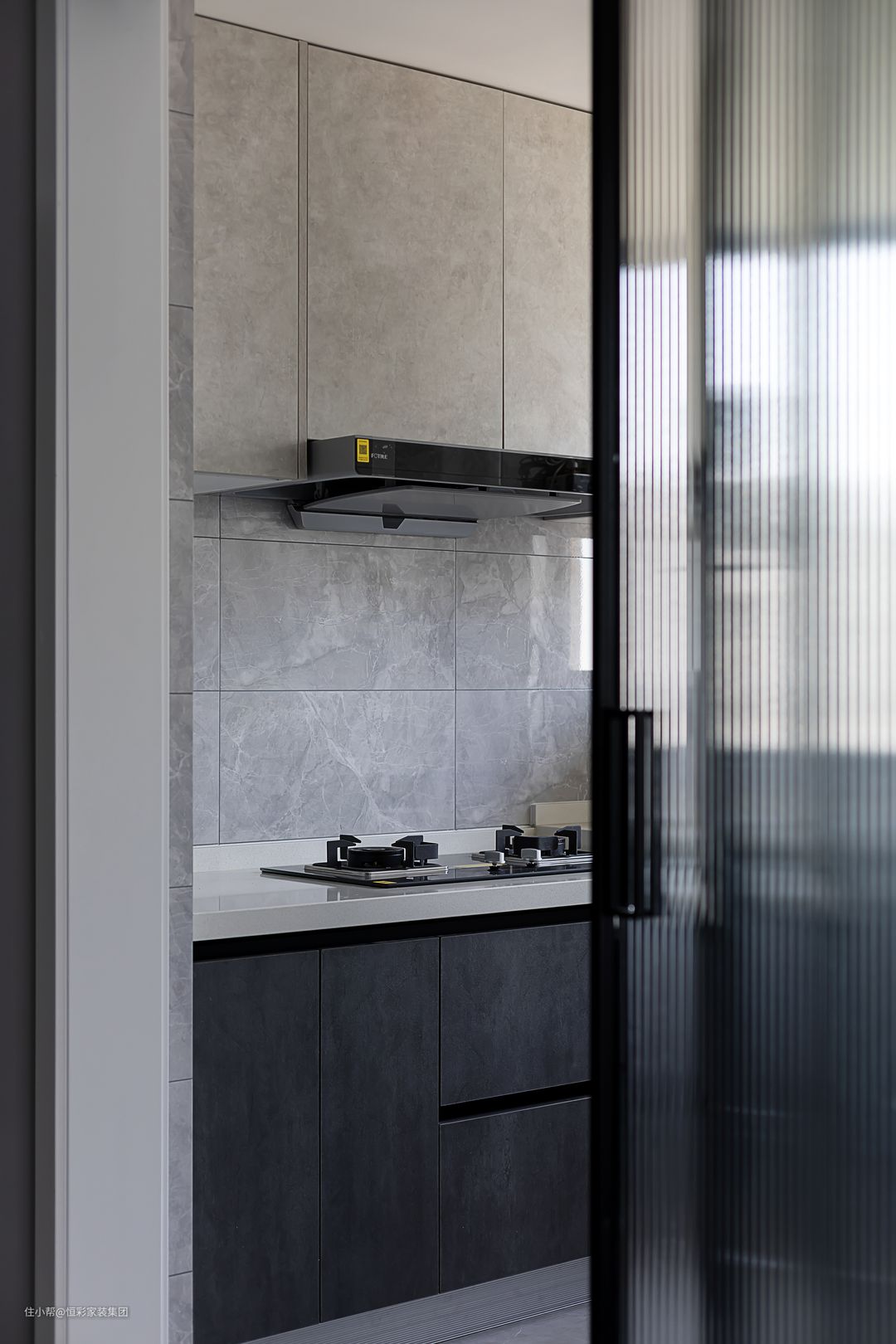 类大理石纹路的柜门配合整个空间灰调的基底,极具艺术感和轻奢质感。