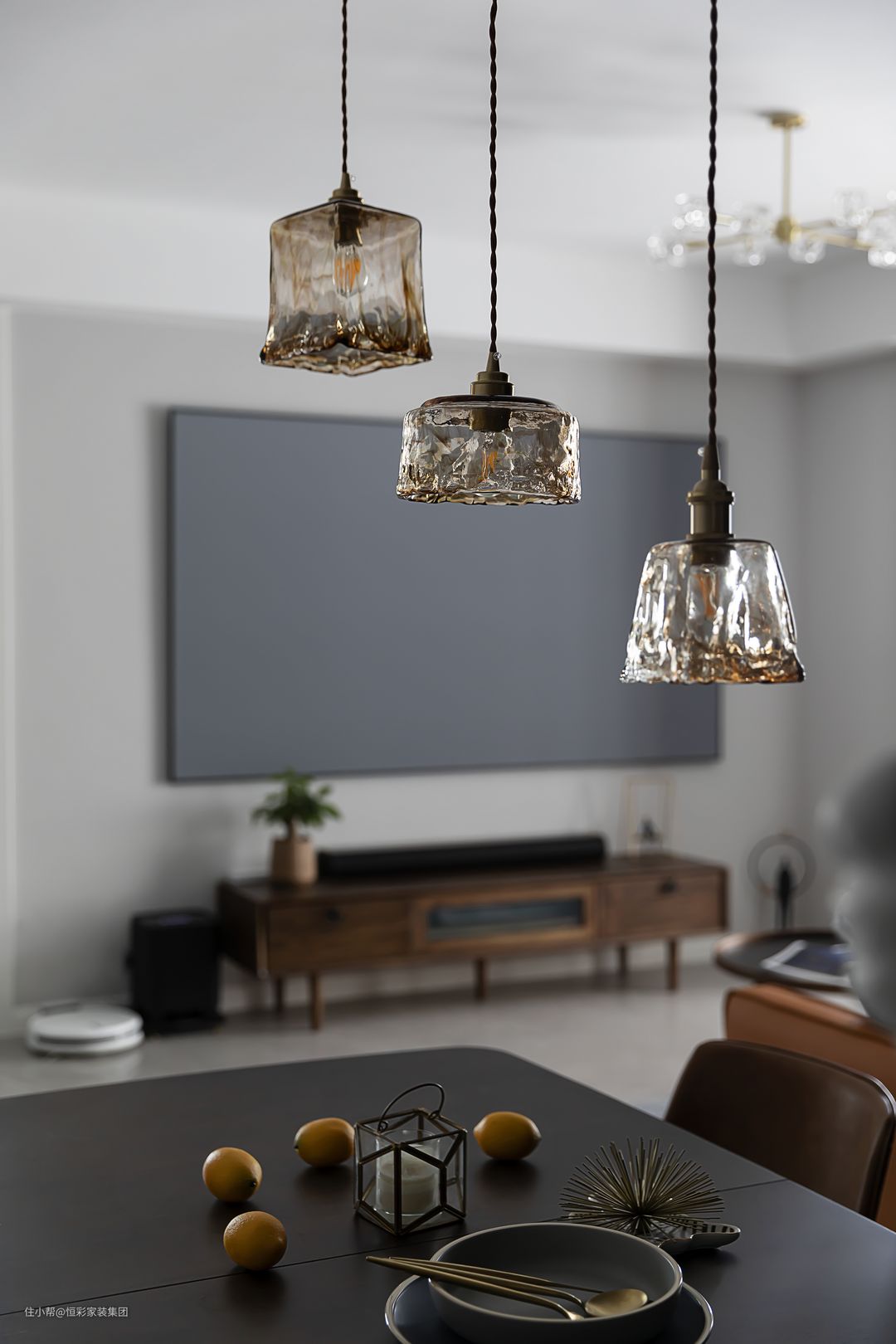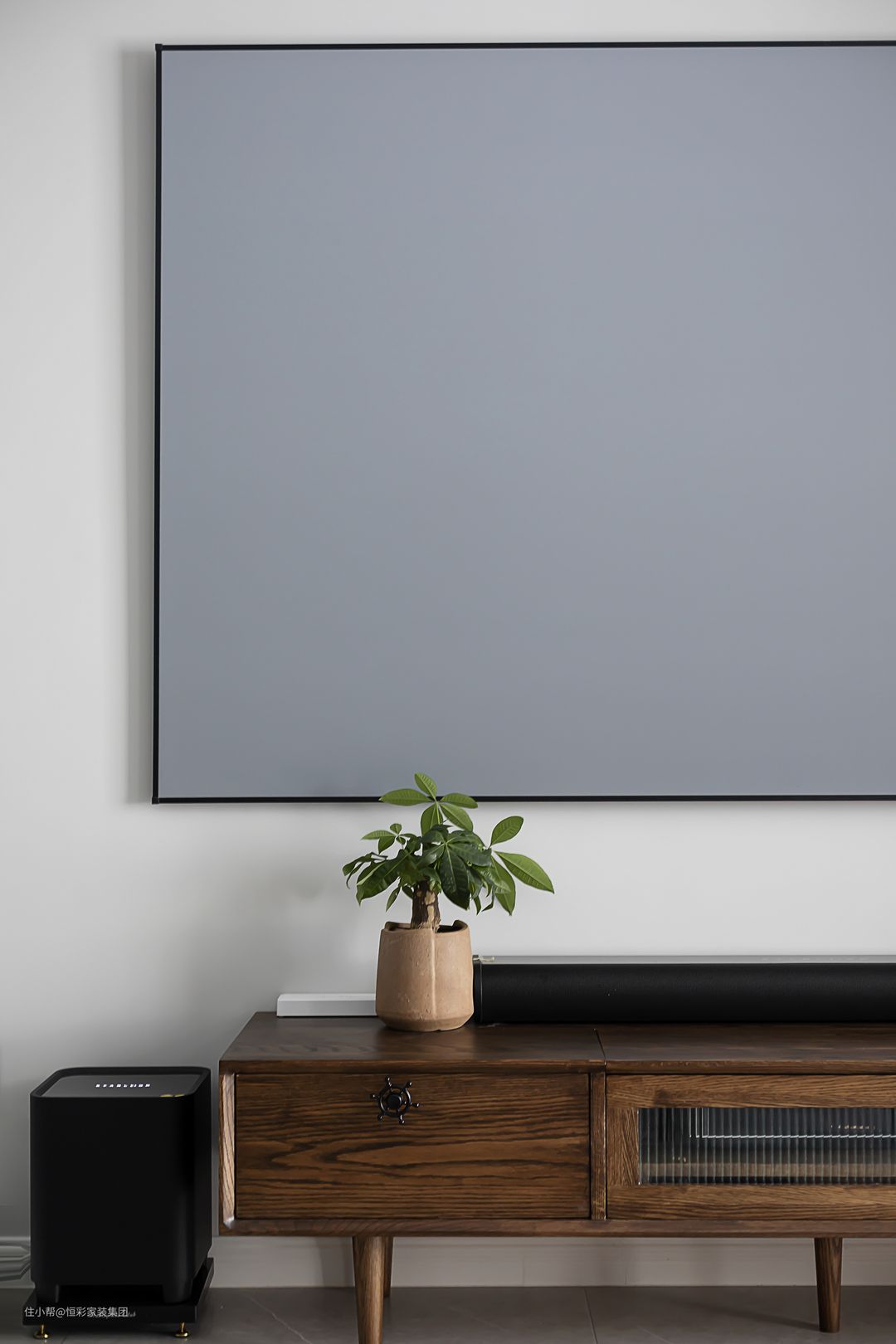 为配合投影幕布,电视背景墙并未凹造型,简简单单刷成大白墙,与实木肌理的电视机柜组合,画面清爽养眼。