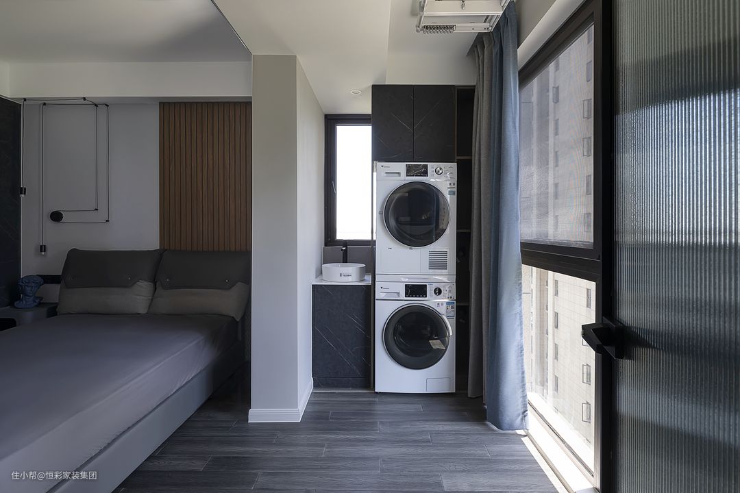 次卧阳台充当生活阳台之用,洗烘设备叠放,再预留出洗手台面的位置,集高颜值与实用性于一体。