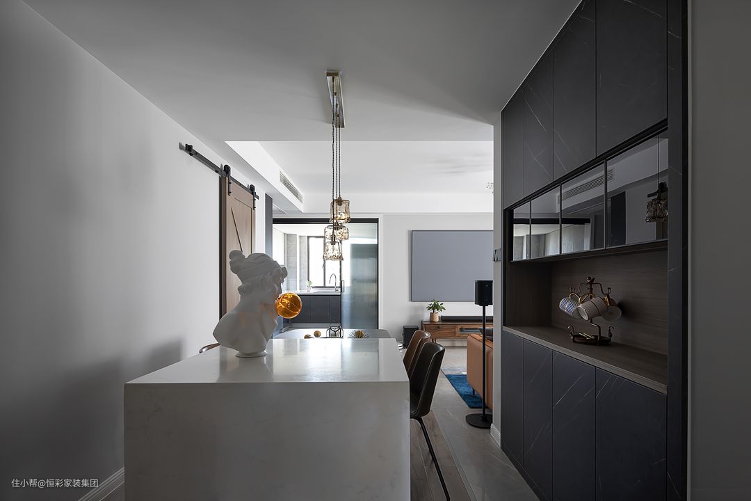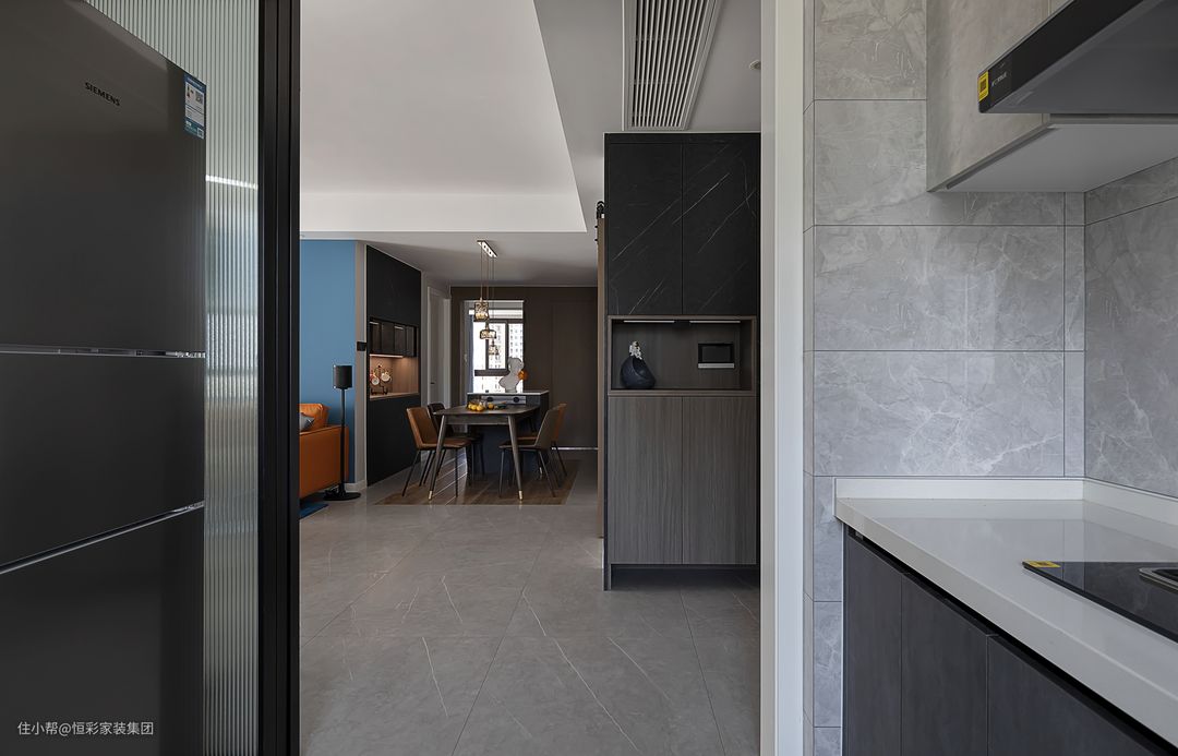 台面、桌椅延续客厅使用过的材质与色调,同时,避免黑色带来的沉闷,与餐厅两两相对的厨房采用长虹玻璃门,引入更多光线,空间显得通透敞亮。