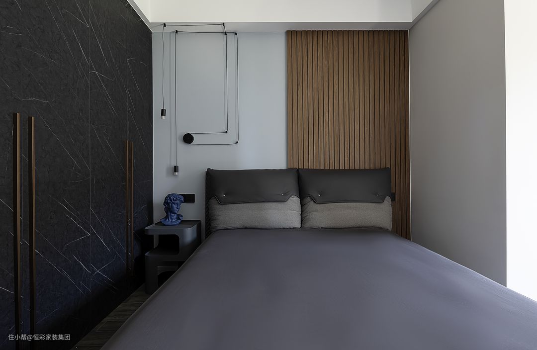 对于背景墙,次卧选用几何线灯与半边木饰面装饰作为舞台主角,打破常规设计,高级不失个性。