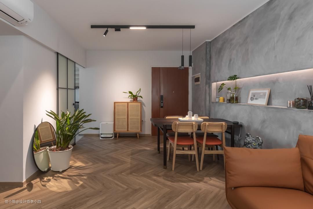 客厅内采用木地板搭配灰色水泥质感的墙壁,再加上射灯,打造出清冷有质感的底色空间,同时又在客厅内选用焦糖色的沙发,为家里增加活力。