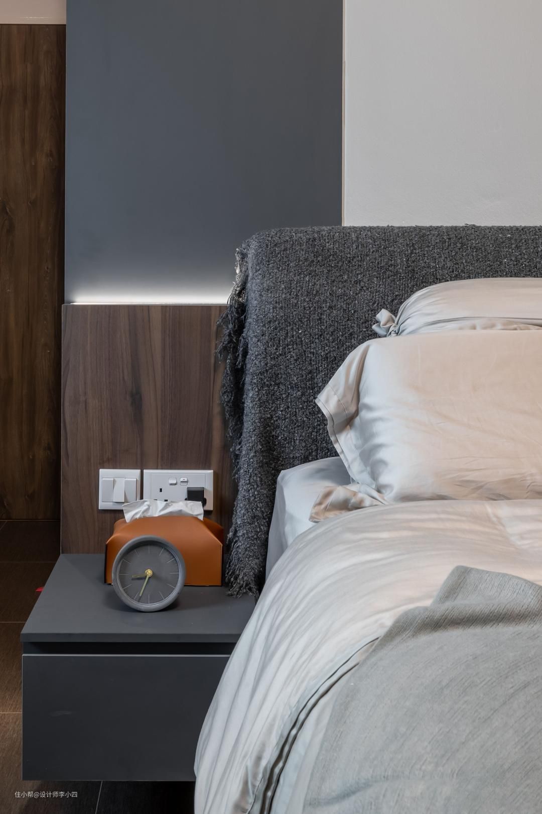 在卧室内选用灰色地砖搭配浅灰、白色墙壁,打造简约干净的休息空间。