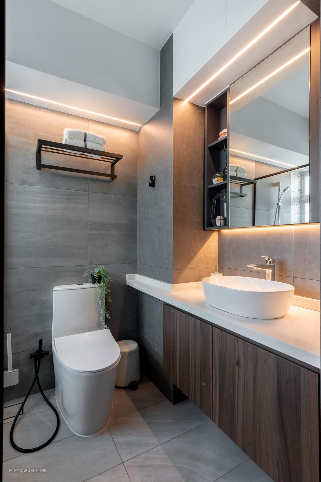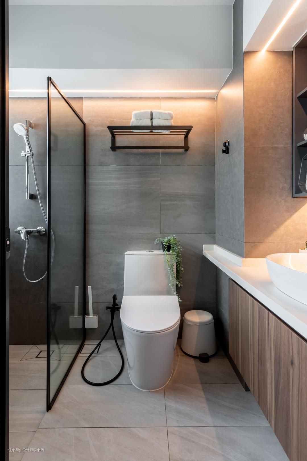 卫生间内采用玻璃墙做半干湿分离,有效缓解淋浴时的水滴落在马桶区,保持整体环境的干燥与整洁。