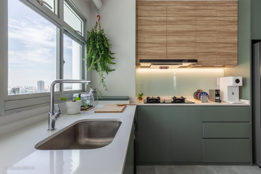 厨房与客餐厅之间采用黑框玻璃推拉门作为隔断,明确规划功能区,让生活更具仪式感,在厨房靠墙处增加吊柜,增加收纳空间,有效保持厨房的整洁。