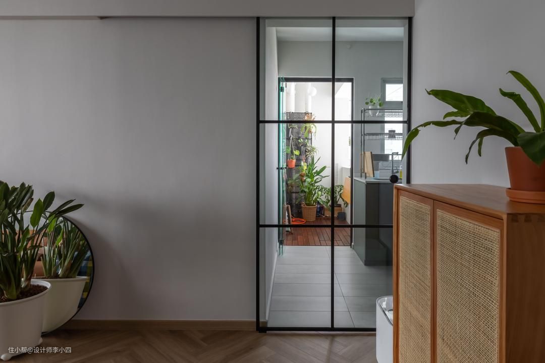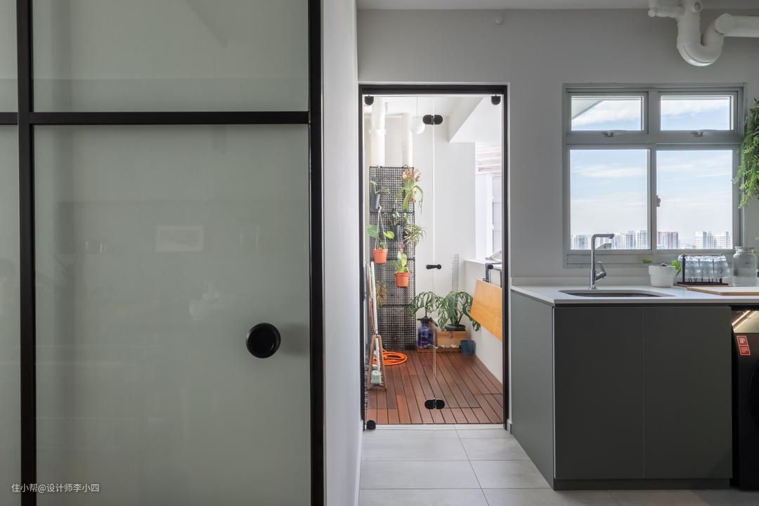 厨房与客餐厅之间采用黑框玻璃推拉门作为隔断,明确规划功能区,让生活更具仪式感,在厨房靠墙处增加吊柜,增加收纳空间,有效保持厨房的整洁。