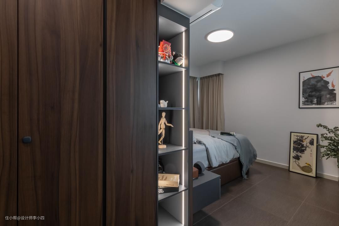 在卧室内选用灰色地砖搭配浅灰、白色墙壁,打造简约干净的休息空间。