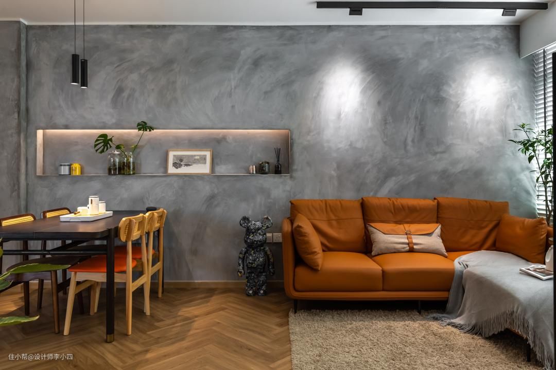 客厅内采用木地板搭配灰色水泥质感的墙壁,再加上射灯,打造出清冷有质感的底色空间,同时又在客厅内选用焦糖色的沙发,为家里增加活力。