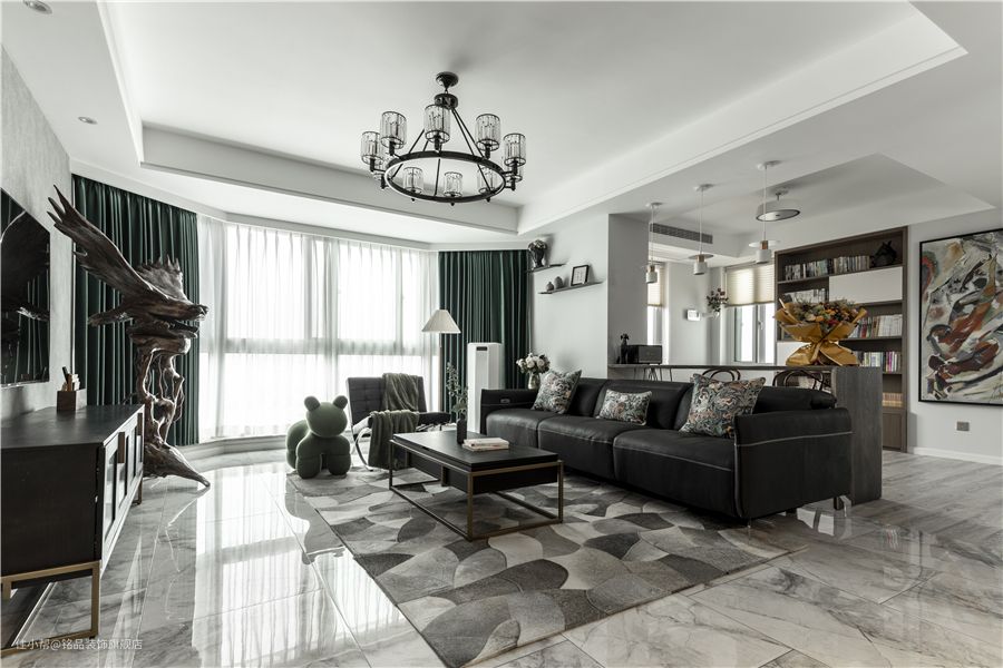 客厅和餐厅以及其他区域没有视线的阻挡,空间显得非常大气。设计师在客厅空间选用了黑、白、灰以及非常跳脱的墨绿色,以撞色来形成视觉上的冲突,时尚感极其强烈。