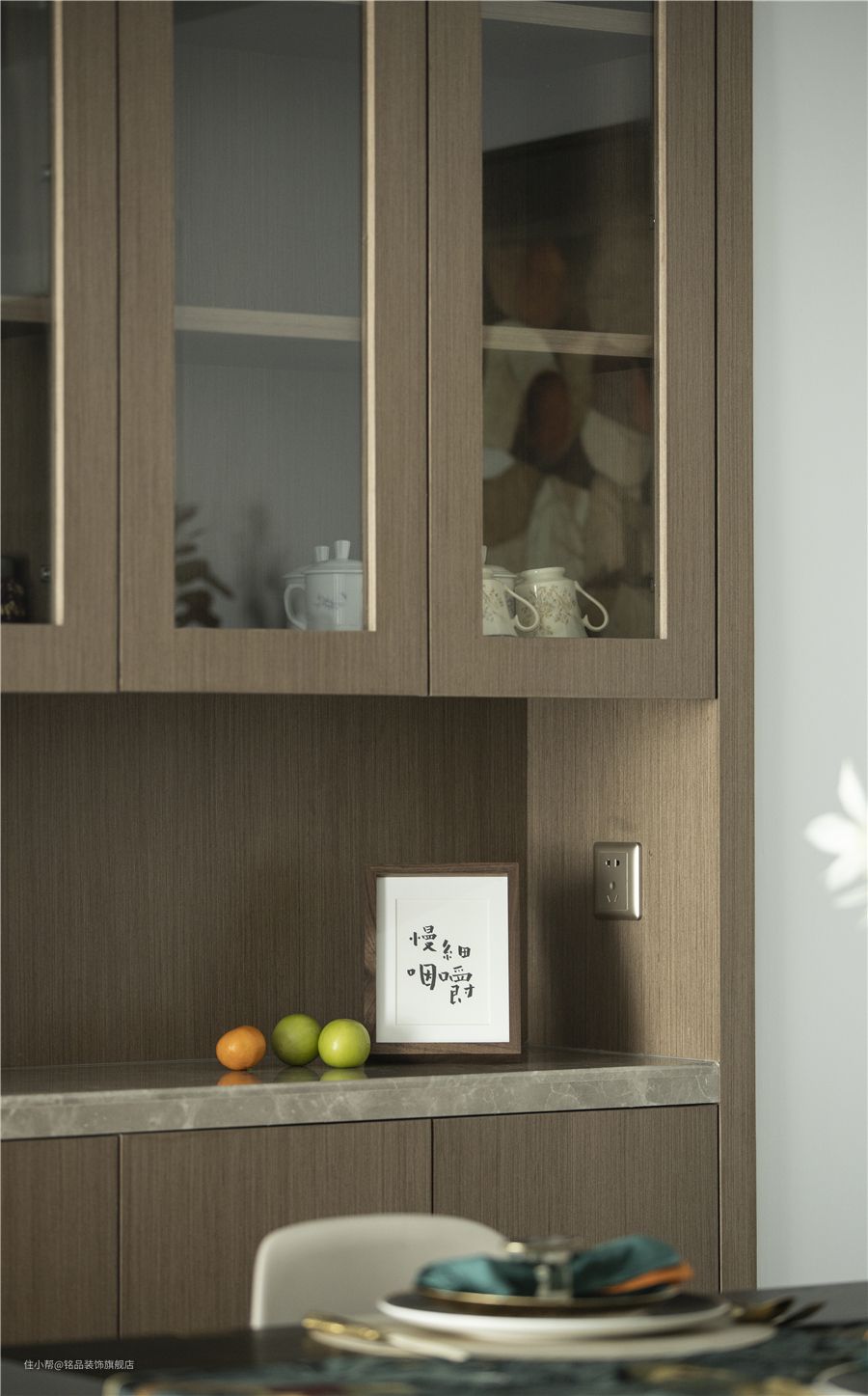胡桃木色的餐边柜分为上中下三个部分,上部柜是玻璃门形式的展览区域,平时主人家收藏的美酒、精致的杯盏等都可以陈列于此;中间归是开放区,摆放家人的合照、装饰画都是不错的选择,同时右侧靠墙柜体设置了插座,便于使用火锅、炖锅等需要差点的烹饪设备;下部柜子则是封闭式,用于日常的收纳或是储存都非常合适。