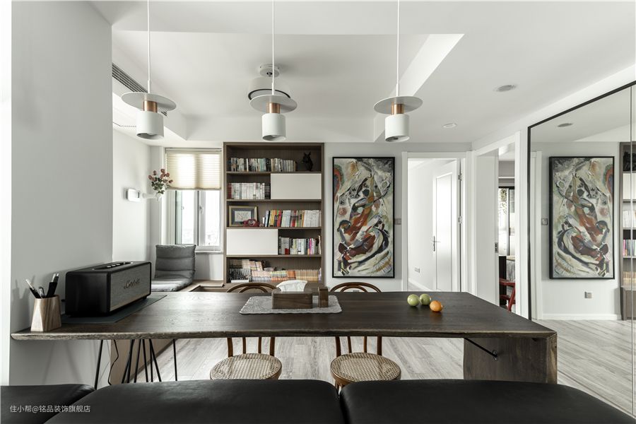 从客厅可以看到看到书房的书柜,其所带来的文学气息也装饰着客厅。闲暇时坐在桌上轻轻翻阅书籍,也不失为人间至味。