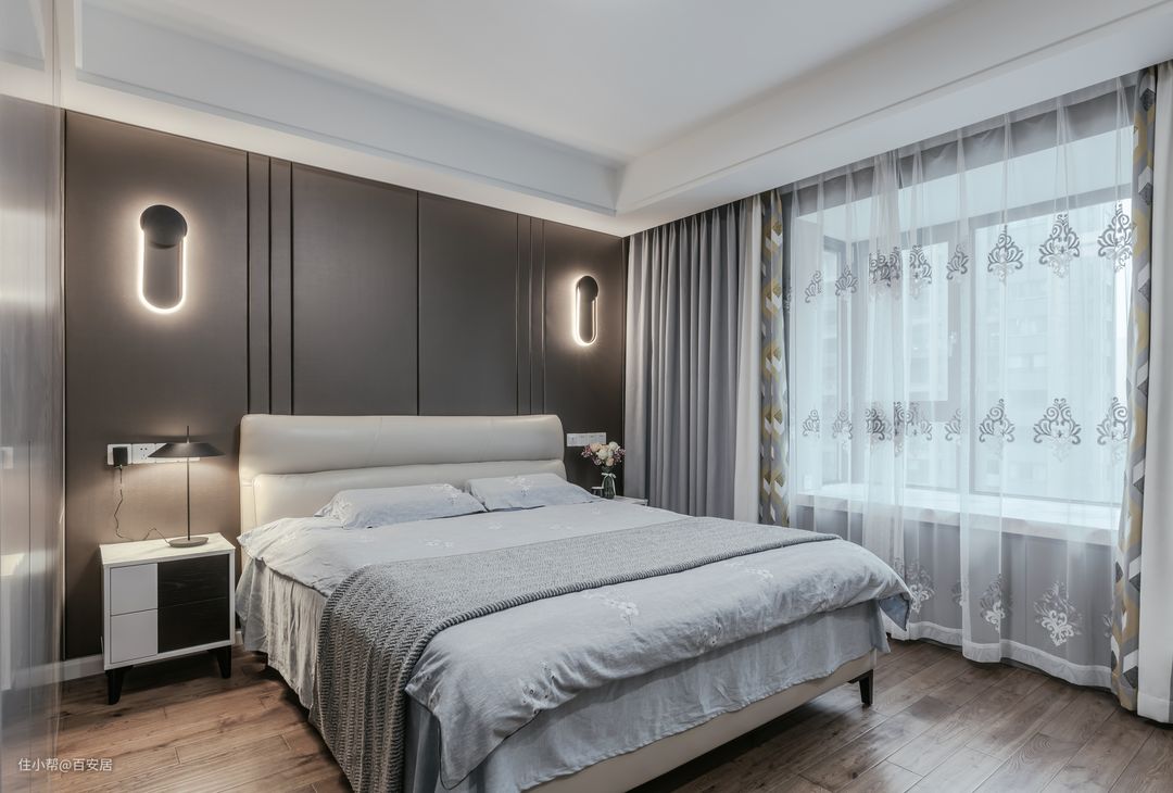 相较于起居室,主卧的氛围更加优雅而颇具有格调。沉静典雅的灰色调背景墙搭配棕色调木质地板,整体氛围自然随性。背景墙凹凸的条纹让整面墙充满质感又不显单调,床头柜也选择木质,白色搭配深棕色,与房间整体的氛围和谐统一。 床头两侧金属材质的壁灯让房间更显温暖舒适,窗帘灰白相间搭配极具层次感。薄纱暗纹窗帘,让明亮的光线更加柔和,增添了浪漫气息,营造一个舒适惬意的温暖空间。