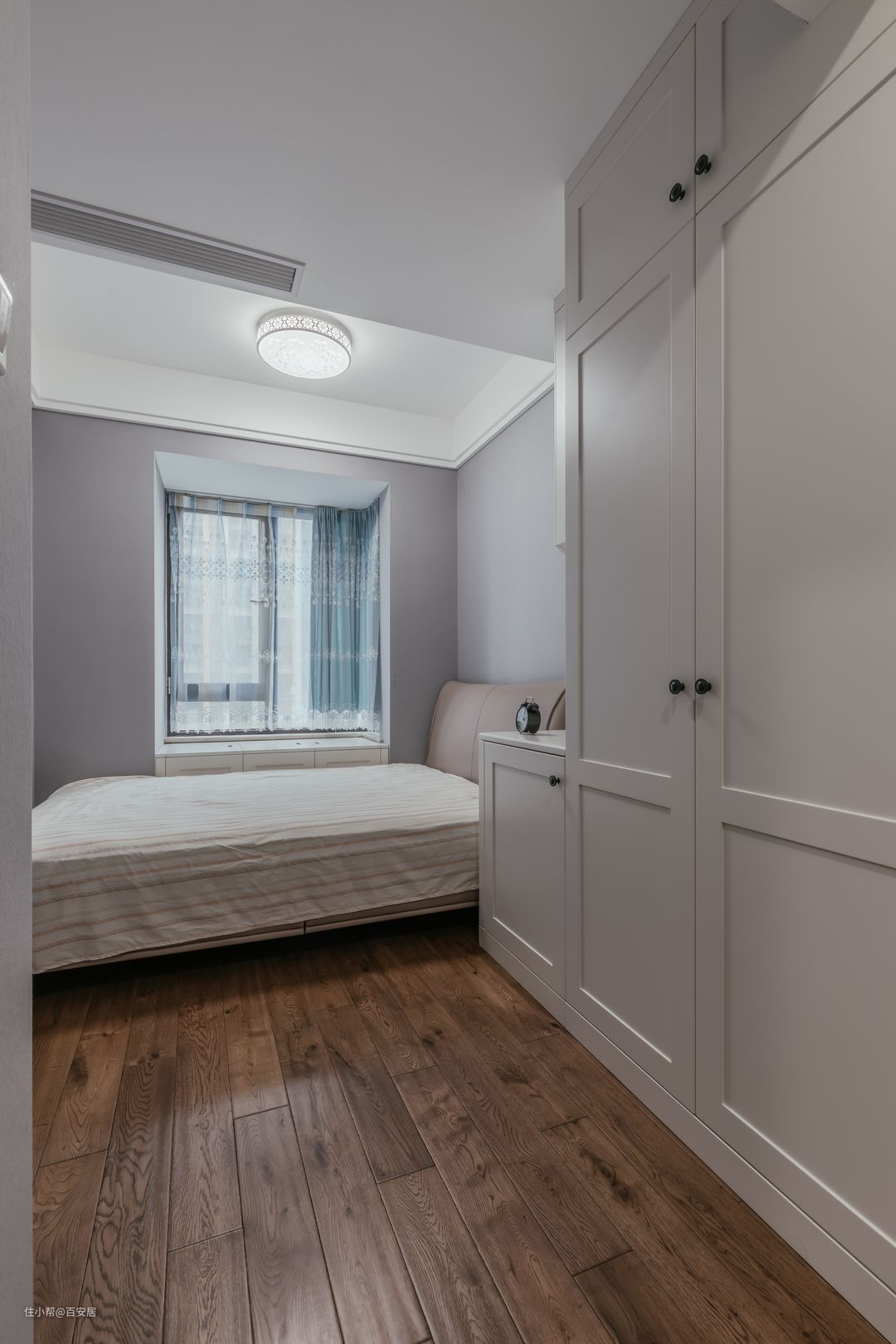 次卧整体采用浅灰色和白色,辅以莫兰迪色加以点缀,通铺原木色实木地板,整体风格较其他空间更加温馨明亮。白色的整体衣柜增大了储物空间,也提升了空间整体亮度,视觉上达到了舒适平衡。 雾霾蓝的窗帘搭配烟灰粉的床品,蓝色的安静娴雅配上粉色的温柔,使人在进入空间那一刻,就犹如和煦的春风拂过脸颊,让人心生温暖。