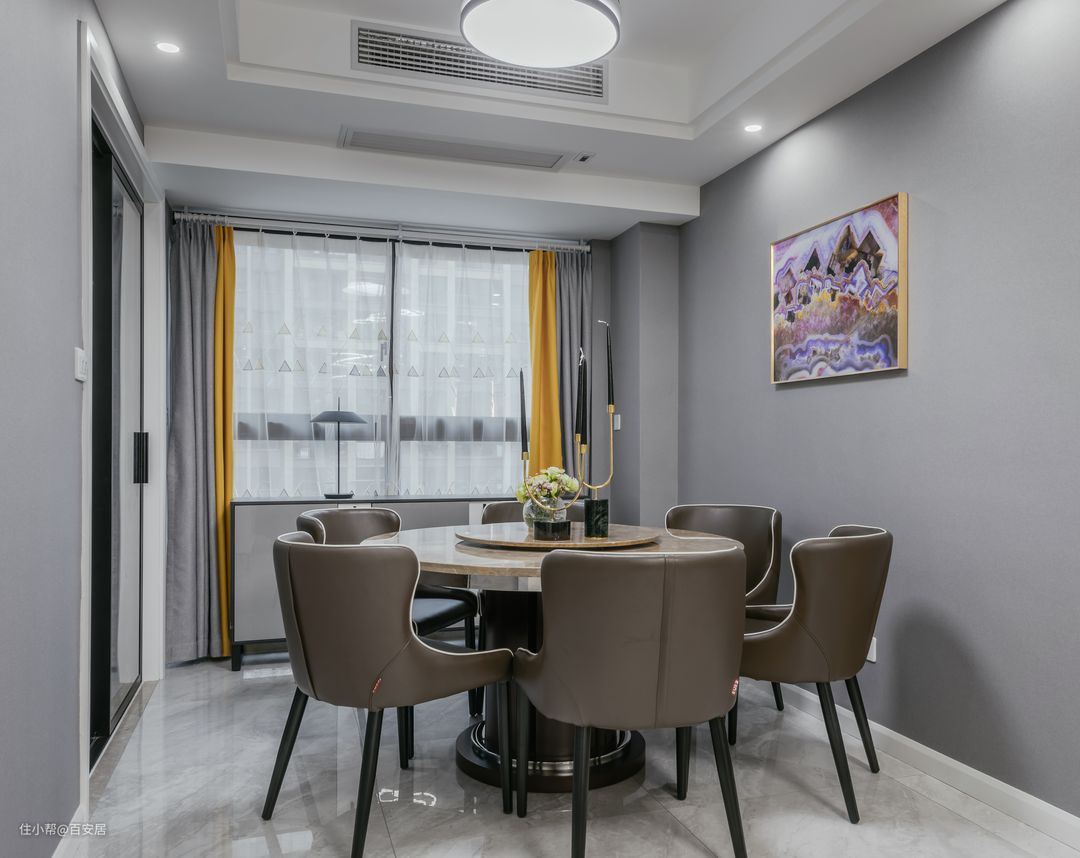 餐厅整体延续了客厅的设计风格,以灰色和白色搭建视觉环境,浅灰和明黄拼接的布艺窗帘与客厅相呼应,色彩上的连贯,使整个空间在视觉上更加统一。 黄色大理石台面餐桌采用双层设计,既美观又实用,搭配舒适的灰色皮质座椅,视觉上沉稳自然,使得每一次用餐都如同在高级餐厅般,充满氛围感。